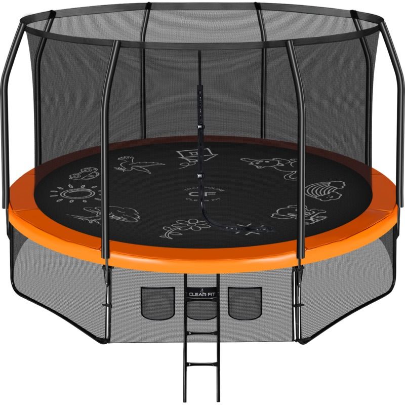 Батут Clear Fit серии FamilyHop — современная концепция семейного батута, объединившая все достоинства предыдущих поколений и учитывающая пожелания пользователей. Основной акцент серии на безопасность, надежность и развлечения для любого возраста. Мощный каркас из толстостенных труб, проверенные метизы, качественные пластик и материалы защиты, износостойкое прыжковое полотно и удобное крепление обеспечивают комфорт и безопасность для каждого члена семьи. Каркасное крепление защитной сети — удобное и надежное, прямое крепление к прыжковому полотну и дополнительная защита входа. Защитный мат — двусторонний, Вы можете выбрать цвет батута при установке и менять его по настроению — ярко оранжевый или изумрудный. В комплект входит спринклер, устанавливается по периметру батута, в жаркий день можно подключить подачу воды и наслаждаться прохладными брызгами. Для малышей на полотно нанесены рисунки — можно раскрашивать цветными мелками. Дополнительно к батутам размеров 10, 12 и 14 футов можно приобрести сет для баскетбола. Батуты FamilyHop поставляются в максимальной комплектации: батут, верхняя защитная сеть, цокольная защитная сеть, лестница, спринклер. Диаметр прыжковой поверхности 3.8 м идеально подходит для пользователей любого возраста, размеры полотна позволяют комфортно тренироваться взрослым и развлекаться детям, включая подростков. Верхняя защитная сеть оберегает от падений, нижняя защитная сеть исключает случайное попадание под батут во время тренировки. Качественные материалы и мощная рама предусматривают эксплуатацию батута 14FT с нагрузкой до 200 кг.