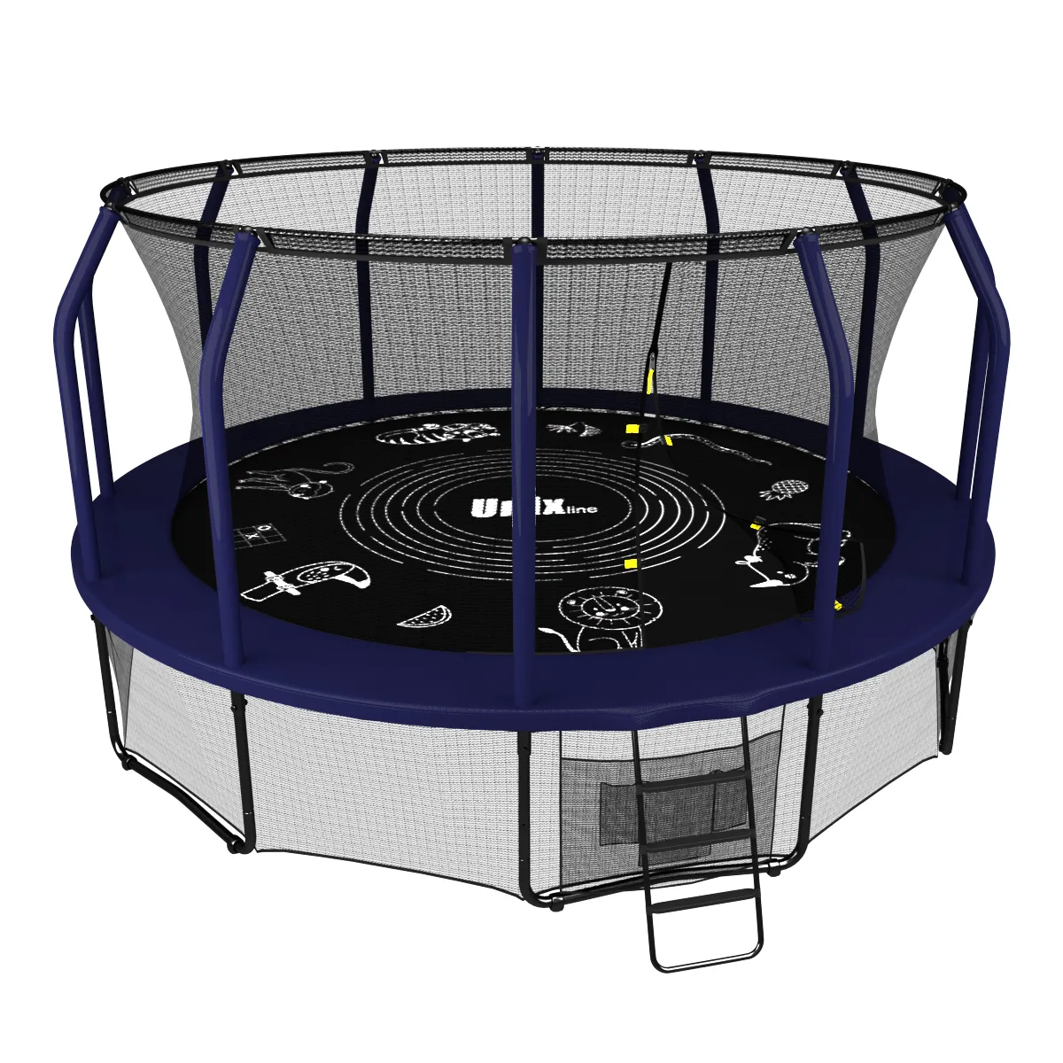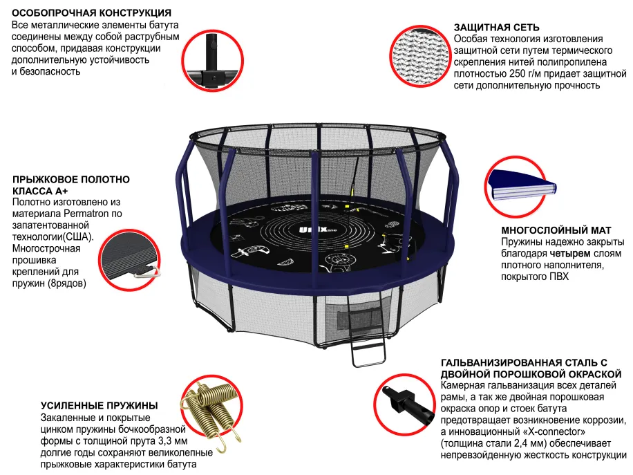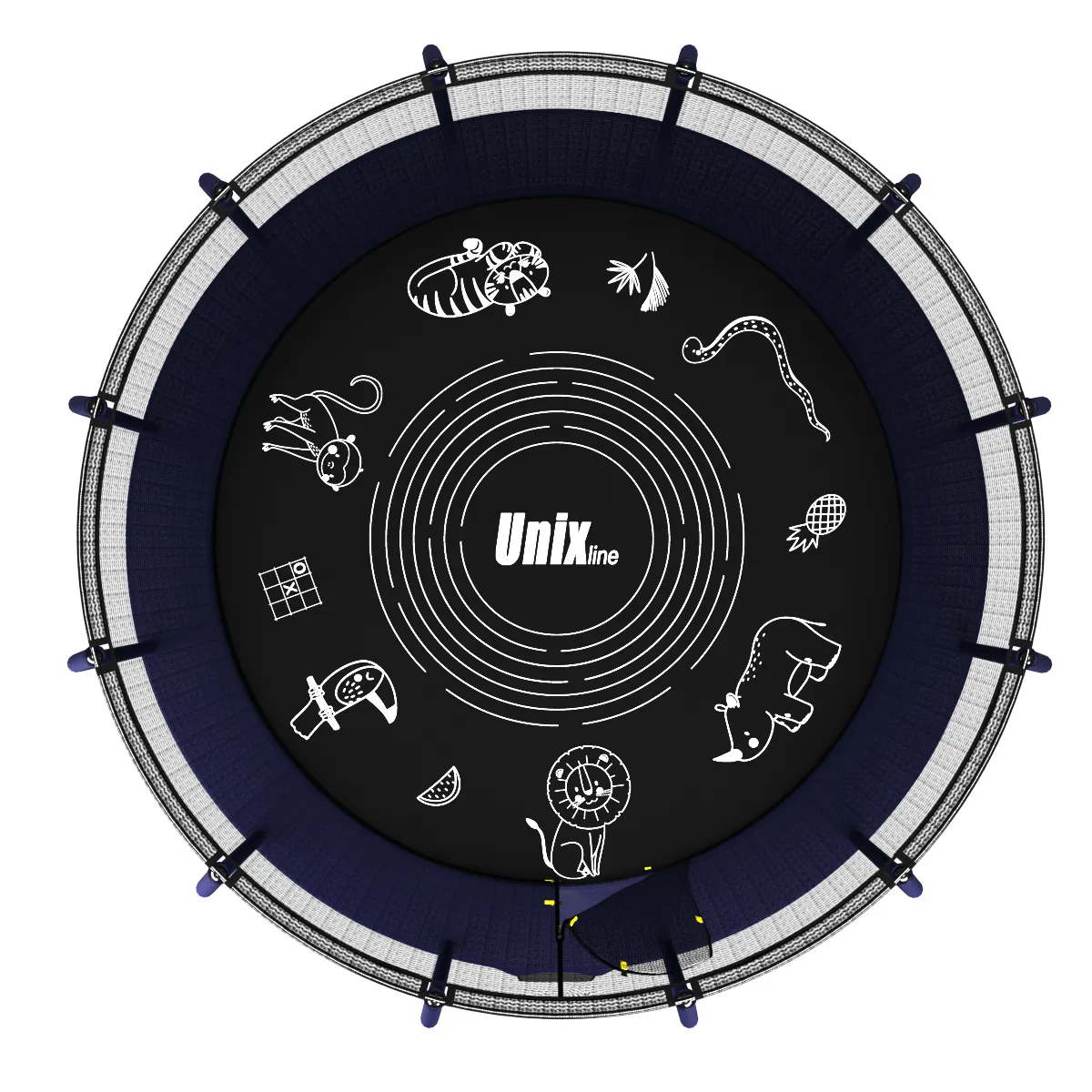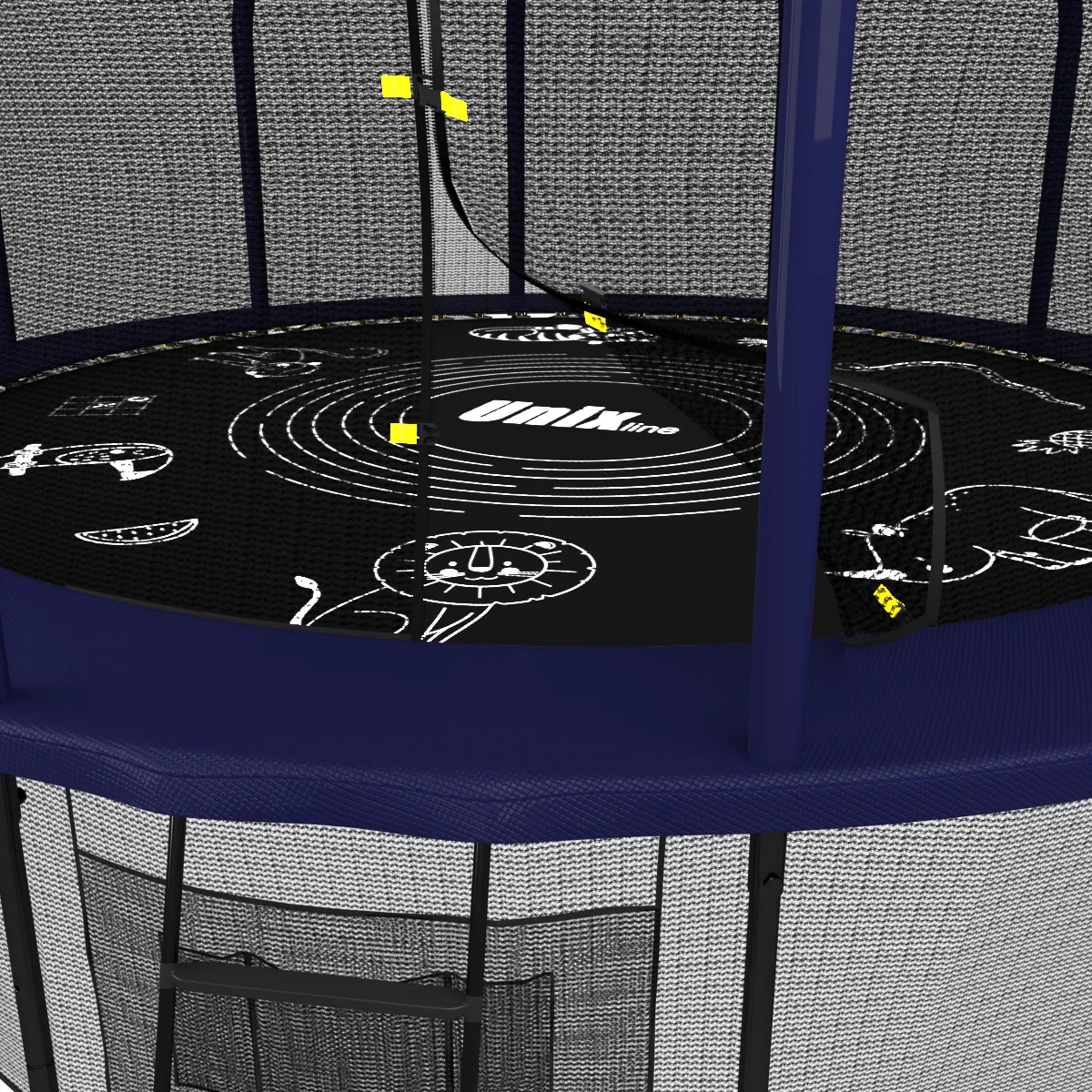 Для реализации самых интересных идей дизайнеры батутов UNIX line SUPREME GAME (4 in 1) специально оставили пустые места на прыжковом полотне. Полная свобода творчества, ограничивающаяся лишь фантазией художника.