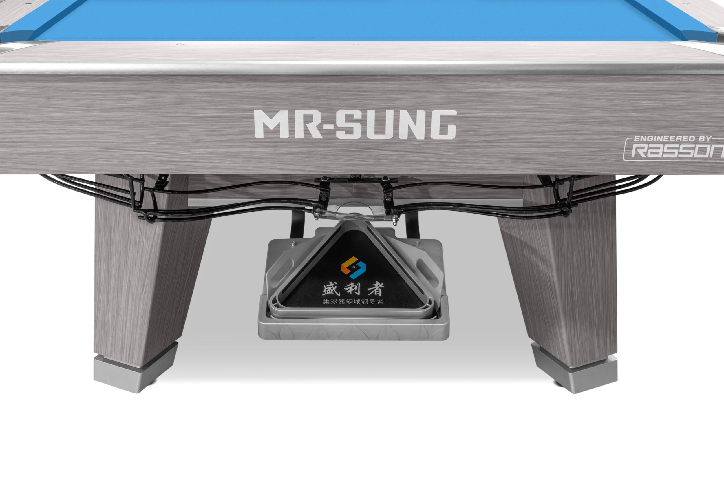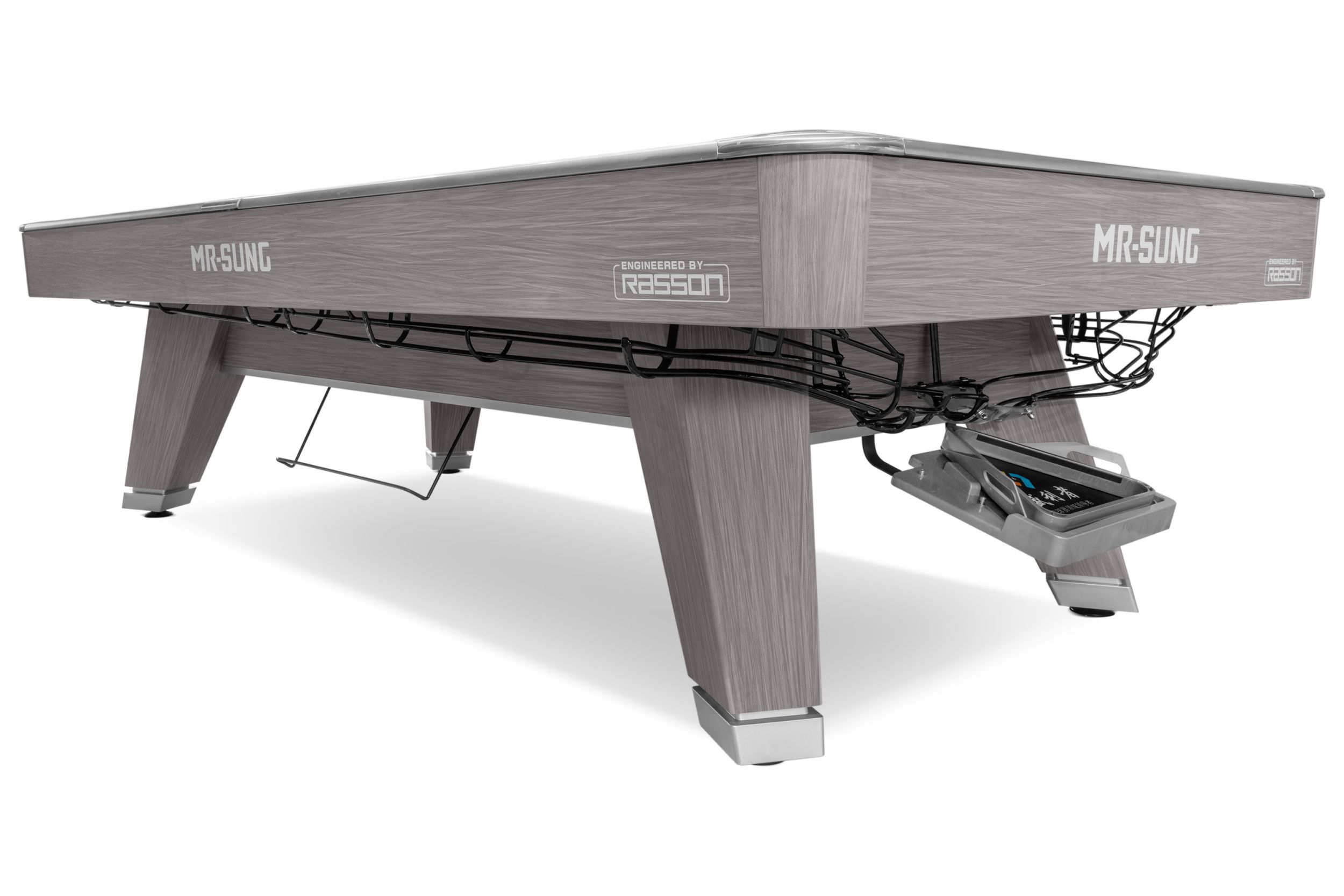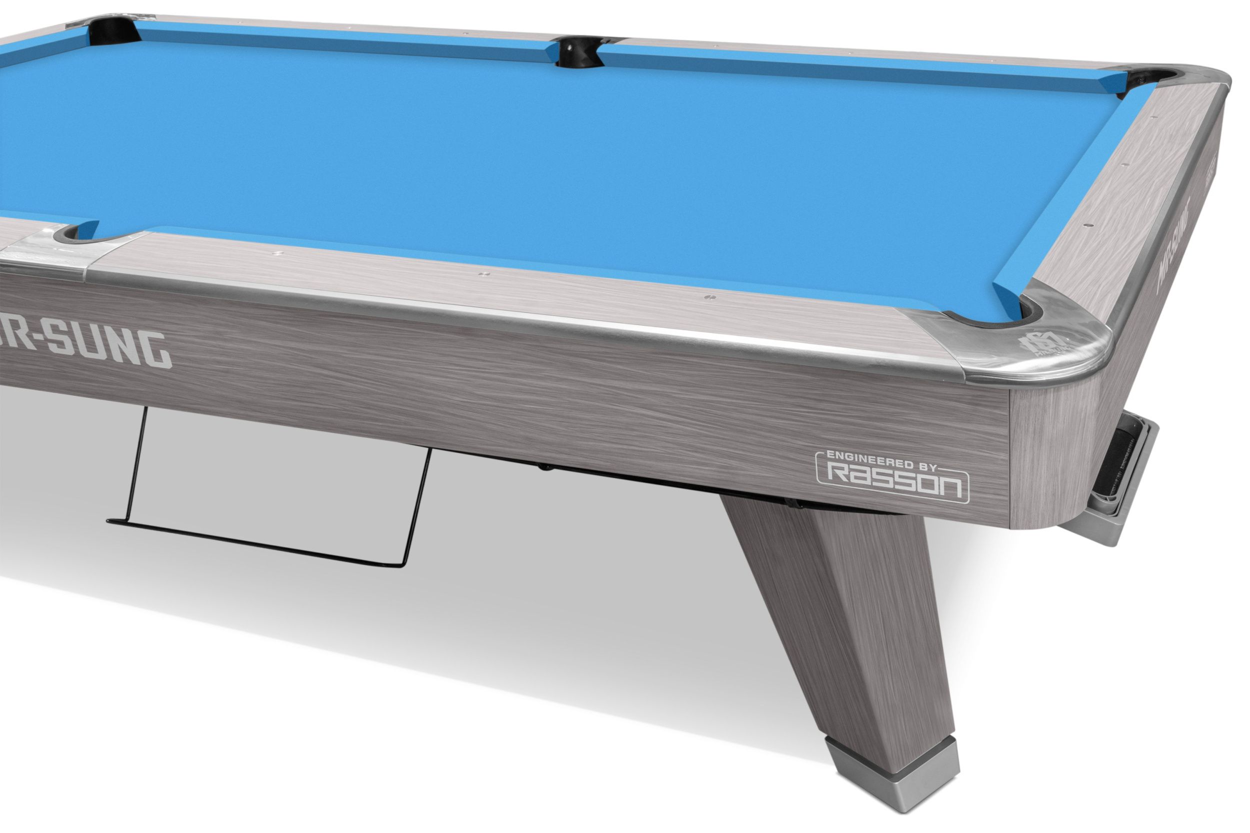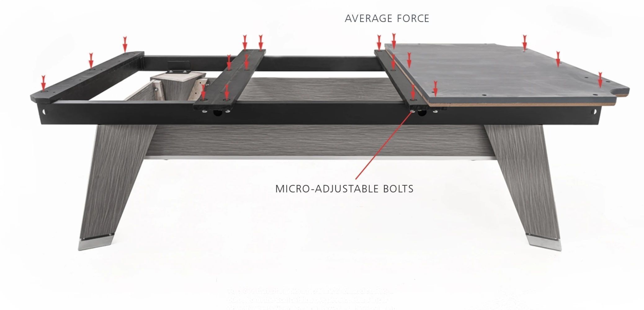 Стол оснащен опорной балкой из стали и дерева. Фирменное выравнивание плиты от Rasson имеет 18 микрорегулируемых точек для идеально ровной игровой поверхности. Удобная и точная система выравнивания плиты обеспечивает превосходную устойчивость.