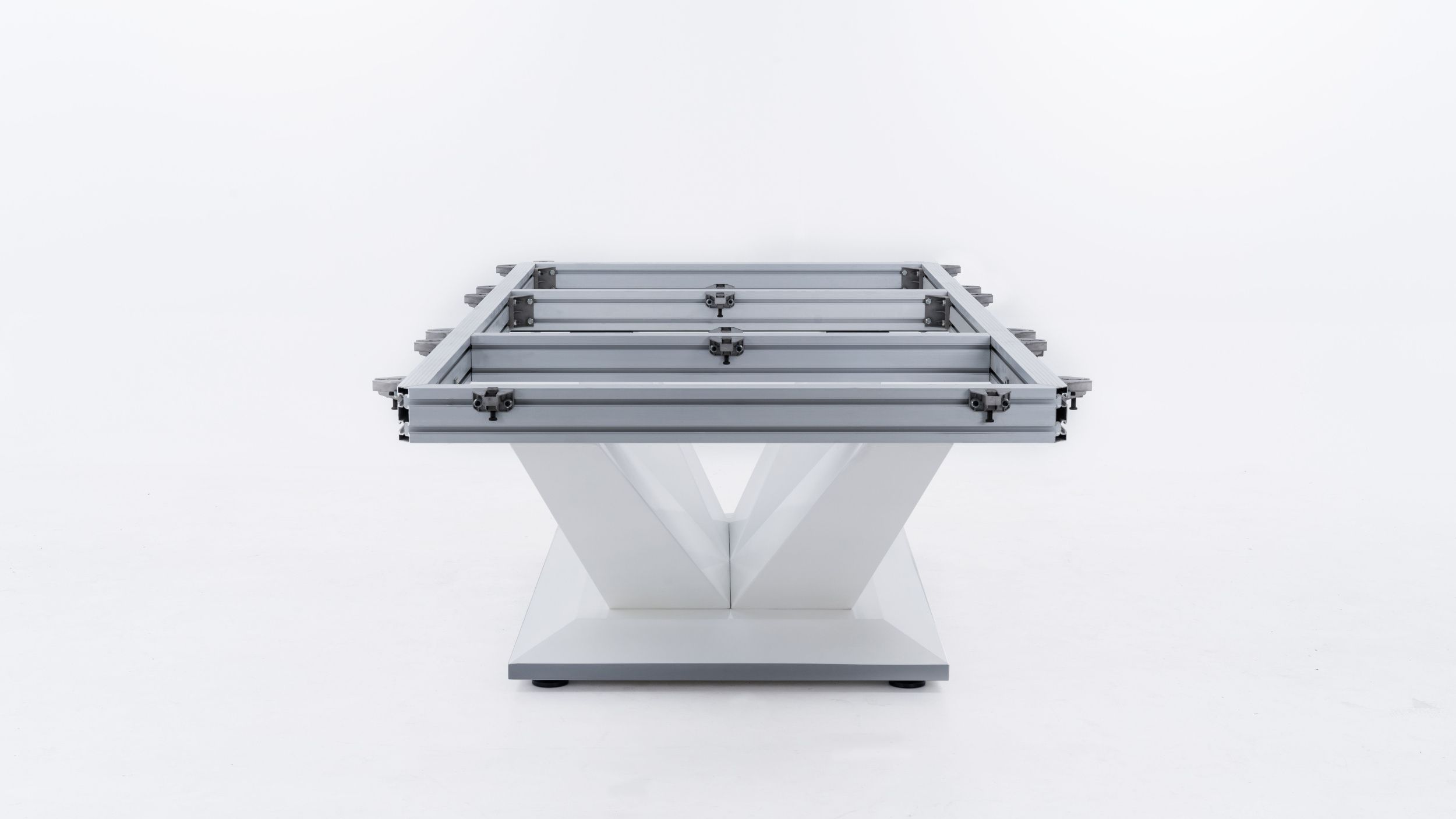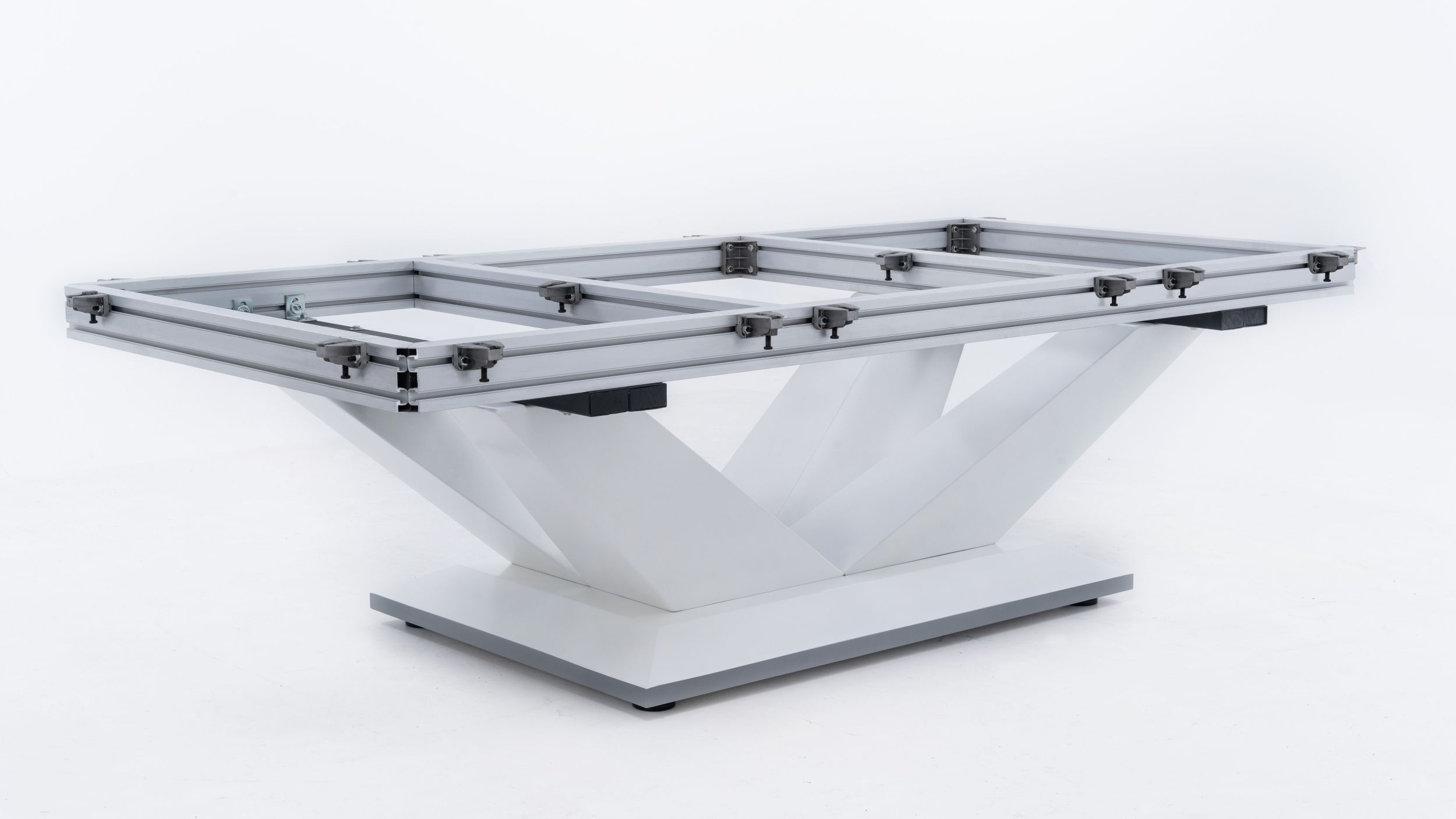 Опорная рама для плиты из балок, сделанная из промышленного алюминия. Конструкция удобно устанавливается, отвечает за превосходную стабильность стола и обеспечивает крепкое основание для сланца. Опорная рама запатентована компанией Rasson.