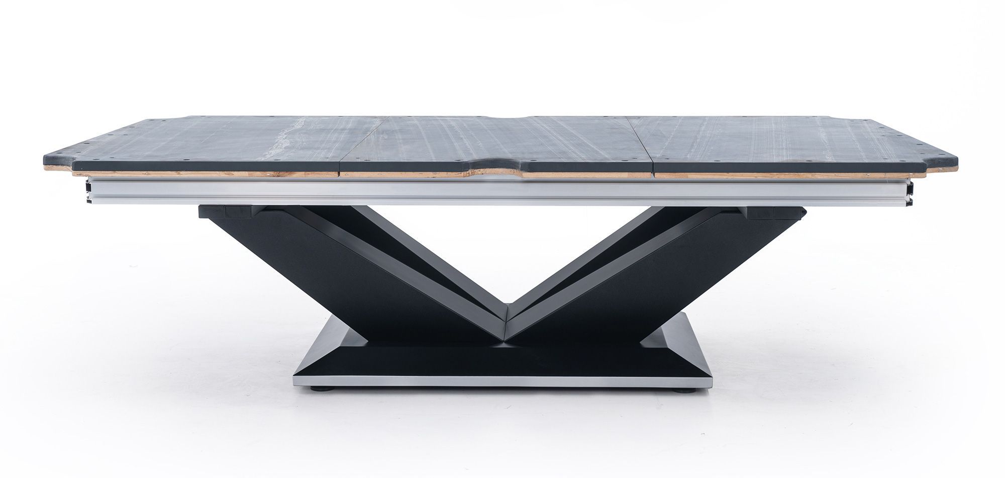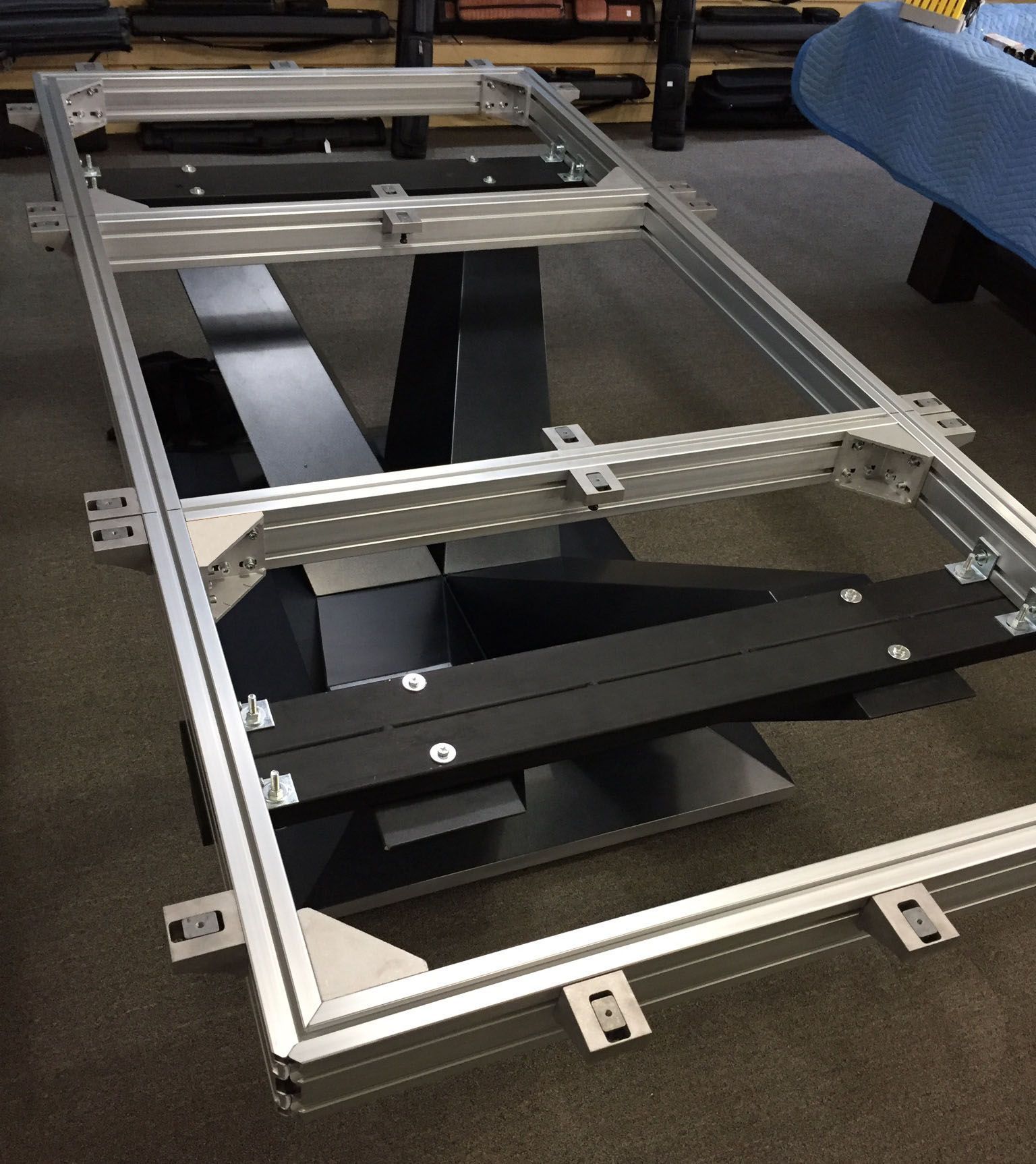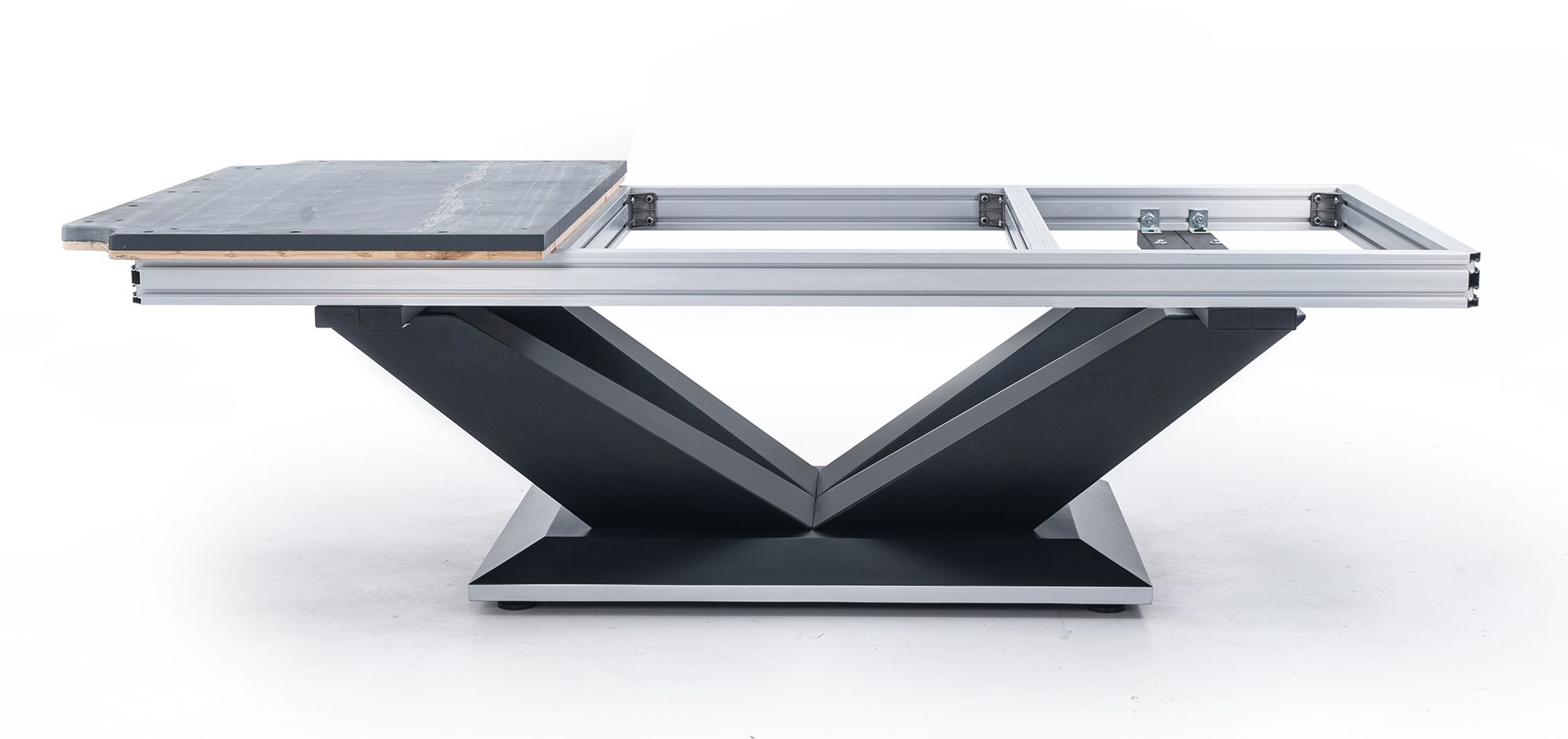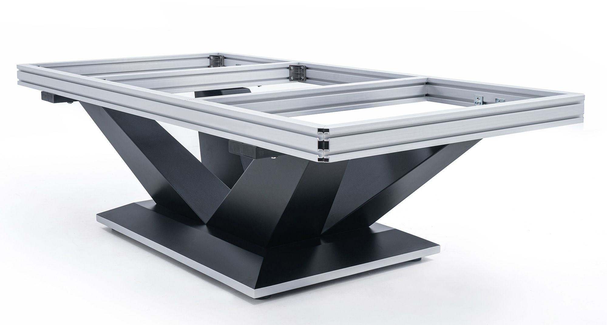 Опорная рама для плиты из балок, сделанная из промышленного алюминия. Конструкция удобно устанавливается, отвечает за превосходную стабильность стола и обеспечивает крепкое основание для сланца. Опорная рама запатентована компанией Rasson.