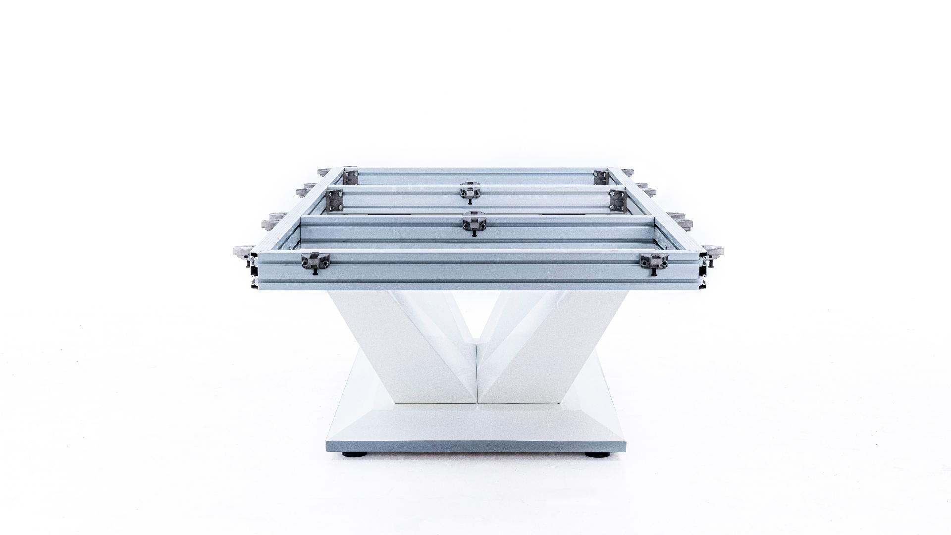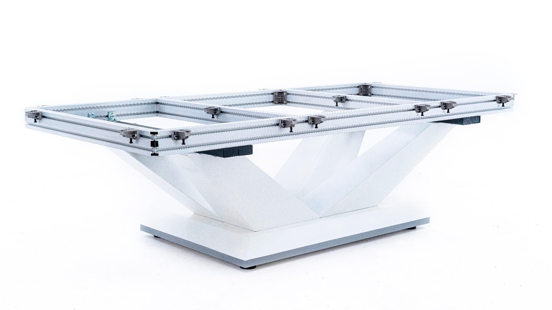 Опорная рама для плиты из балок, сделанная из промышленного алюминия. Конструкция удобно устанавливается, отвечает за превосходную стабильность стола и обеспечивает крепкое основание для сланца. Опорная рама запатентована компанией Rasson.