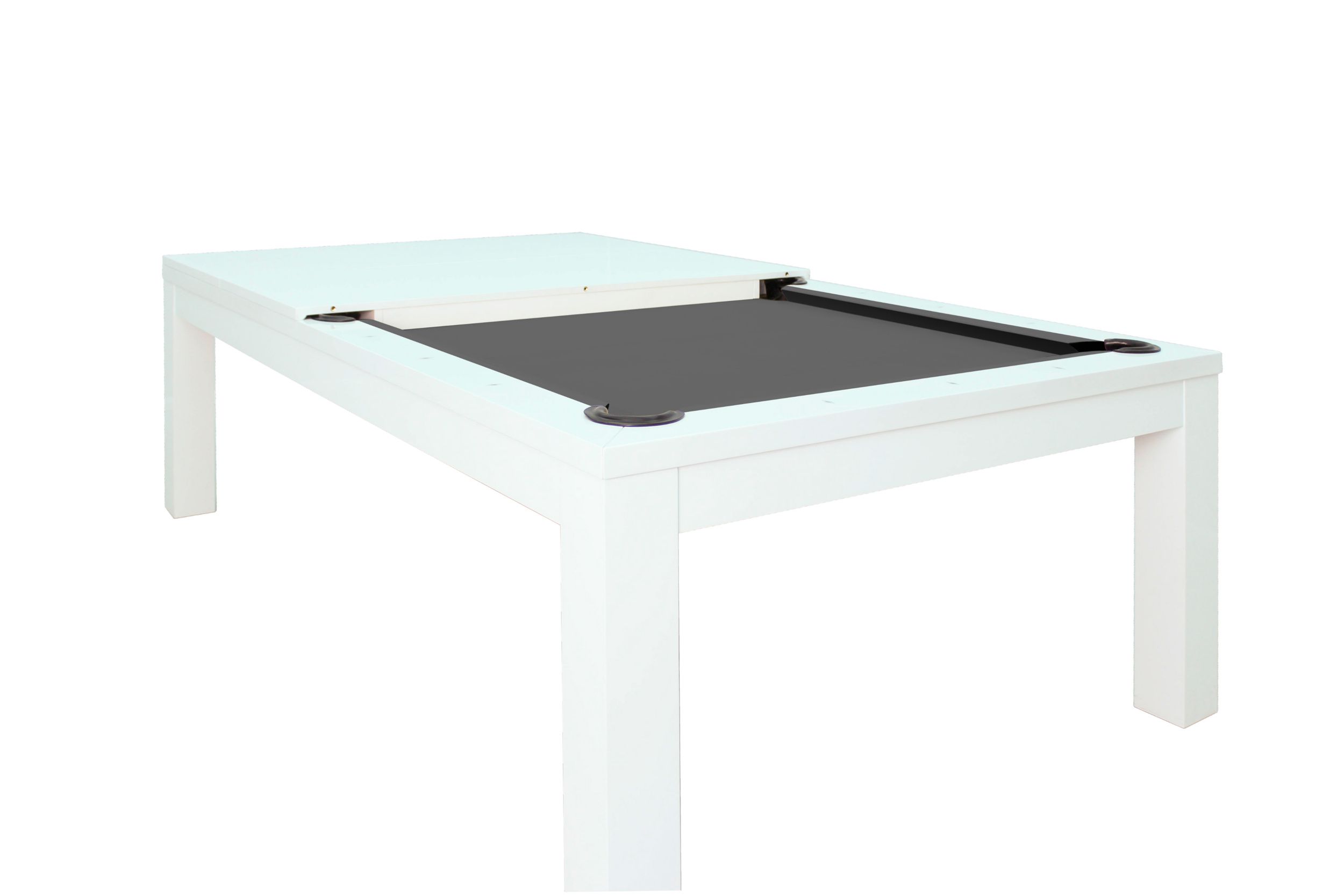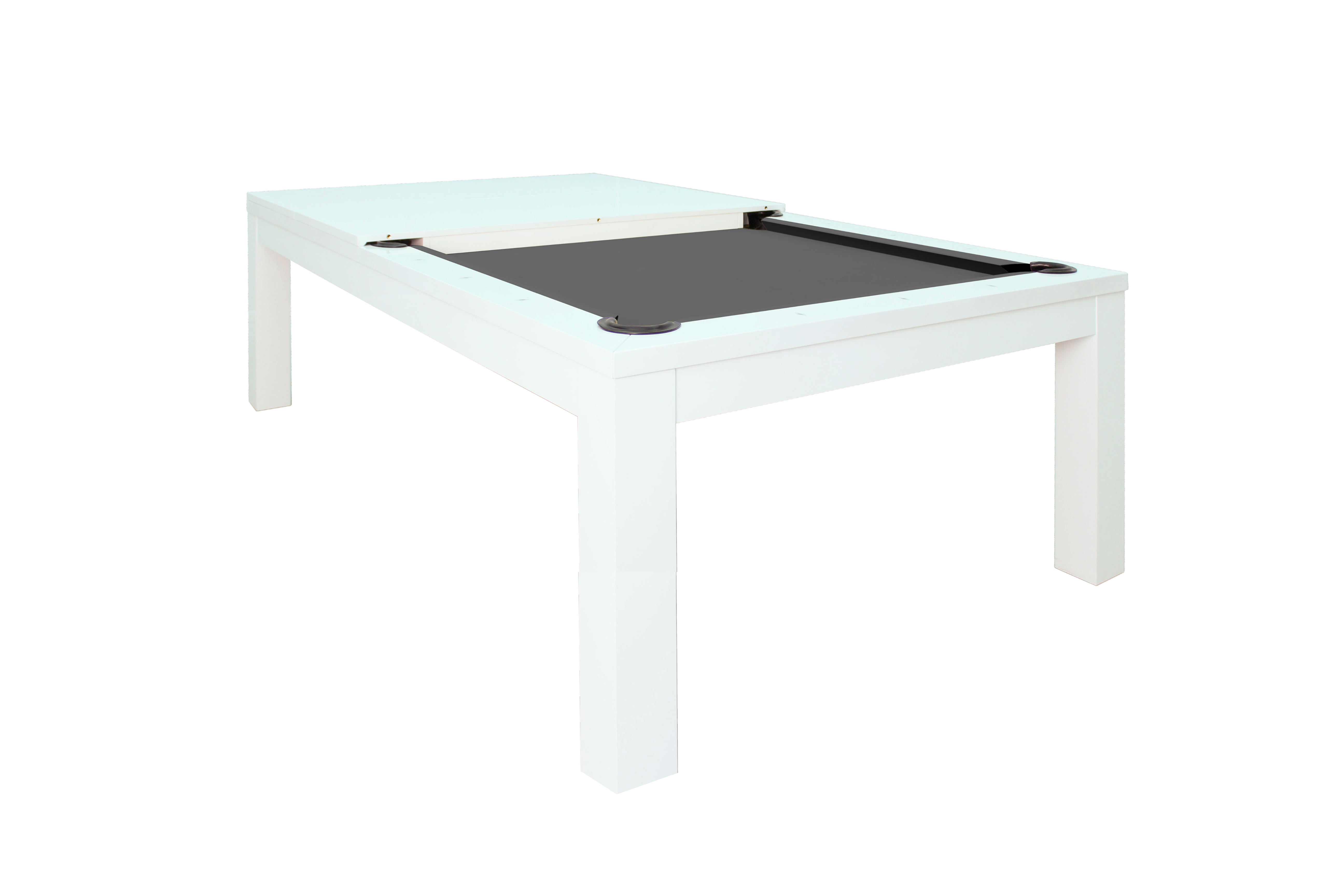 С первого взгляда это элегантный белый стол, который органично впишется в любой интерьер — от классической столовой до современной гостинной зоны. Благородный белый цвет корпуса выглядит свежо и стильно, визуально облегчая массивную конструкцию. Но главная магия скрыта внутри. В комплекте с бильярдным столом идёт специальная столешница, которая устанавливается поверх игрового поля. В считанные минуты бильярд превращается в полноценный обеденный стол, способный с комфортом разместить 12 персон. Это идеальное решение для тех, кто ценит многофункциональность и не готов жертвовать полезным пространством ради хобби.