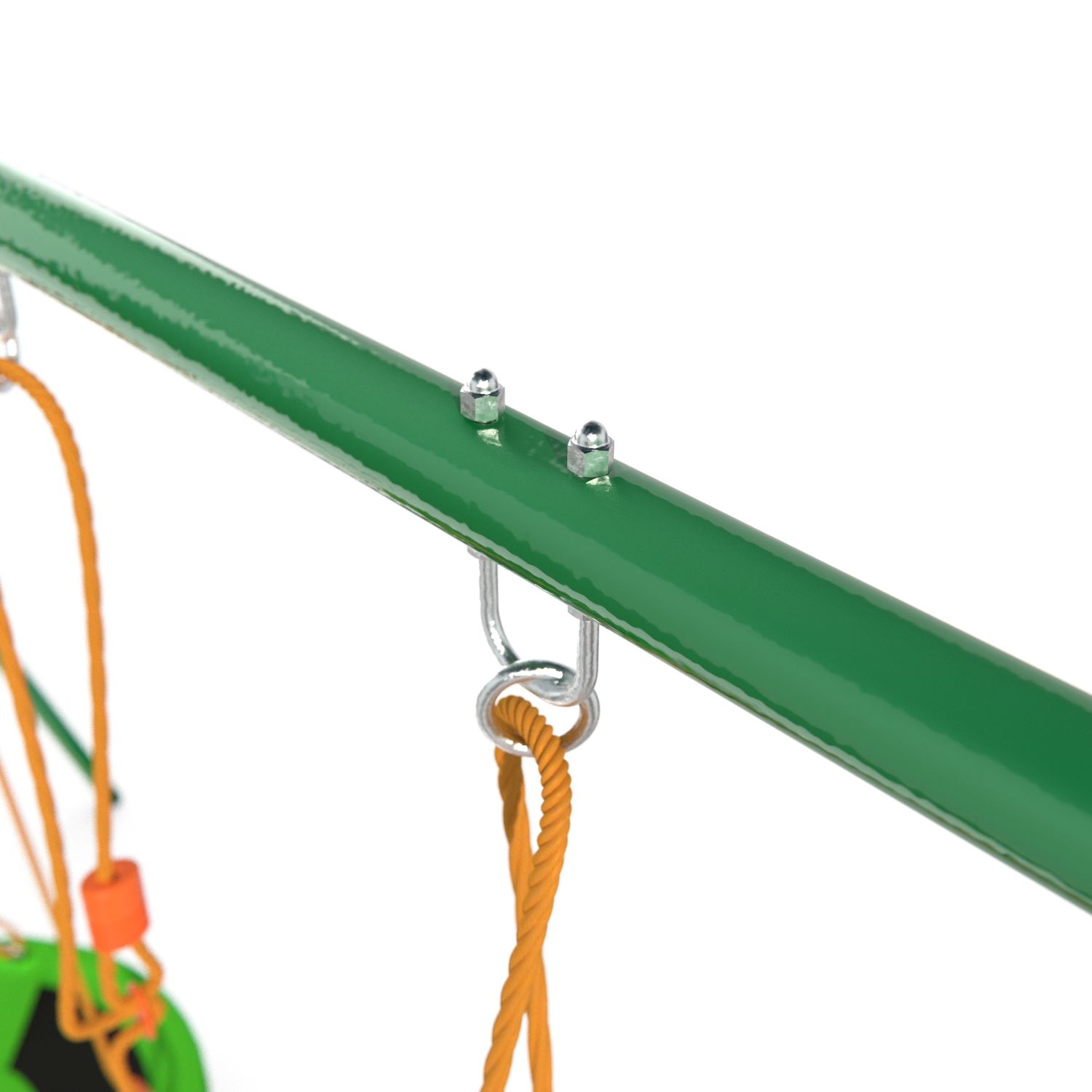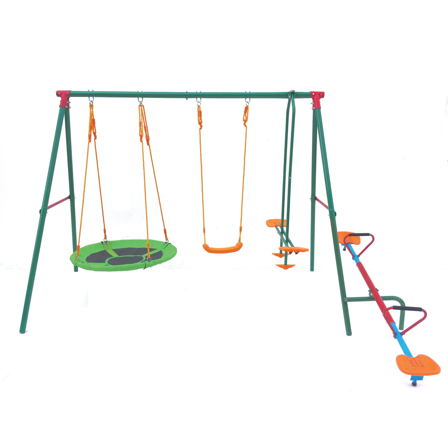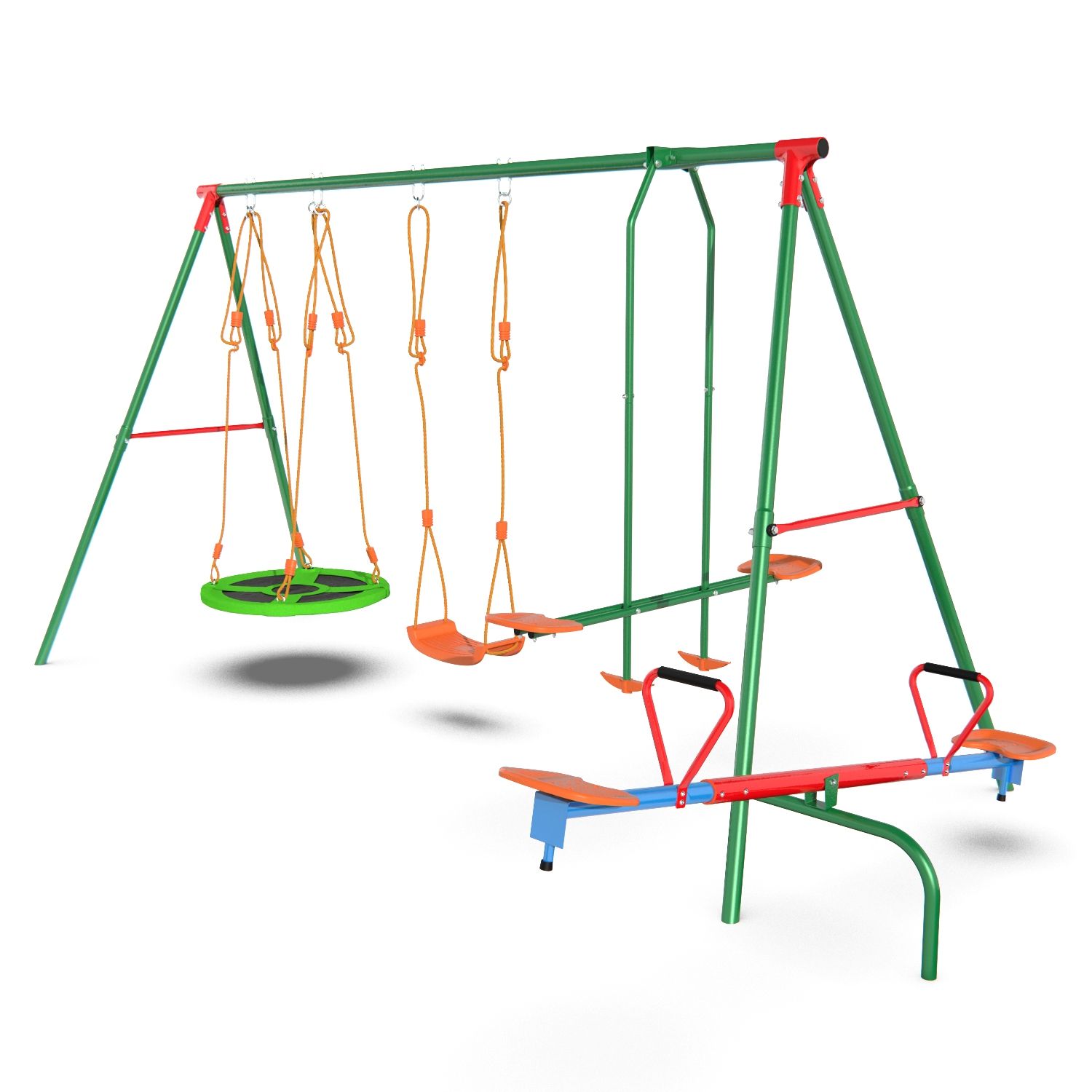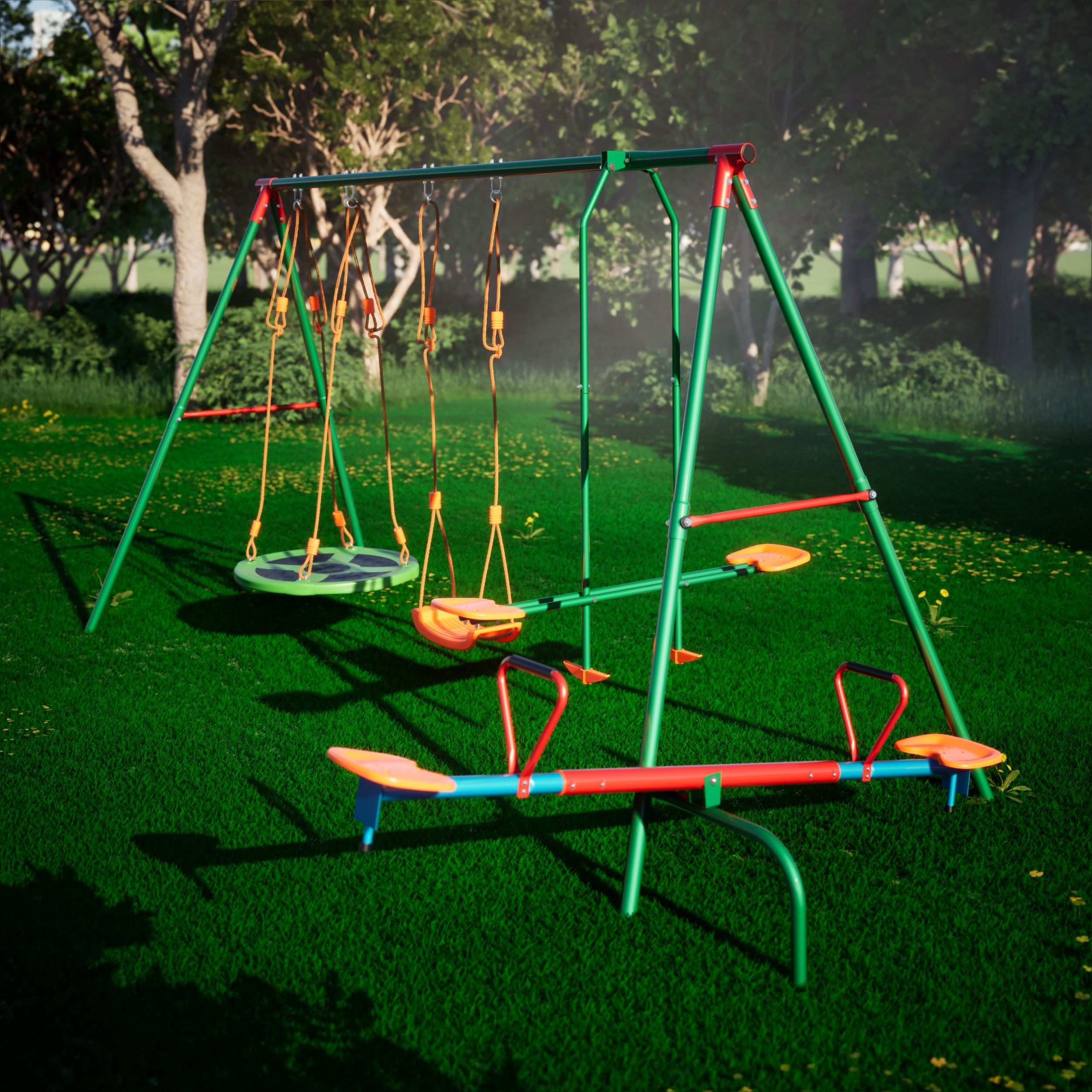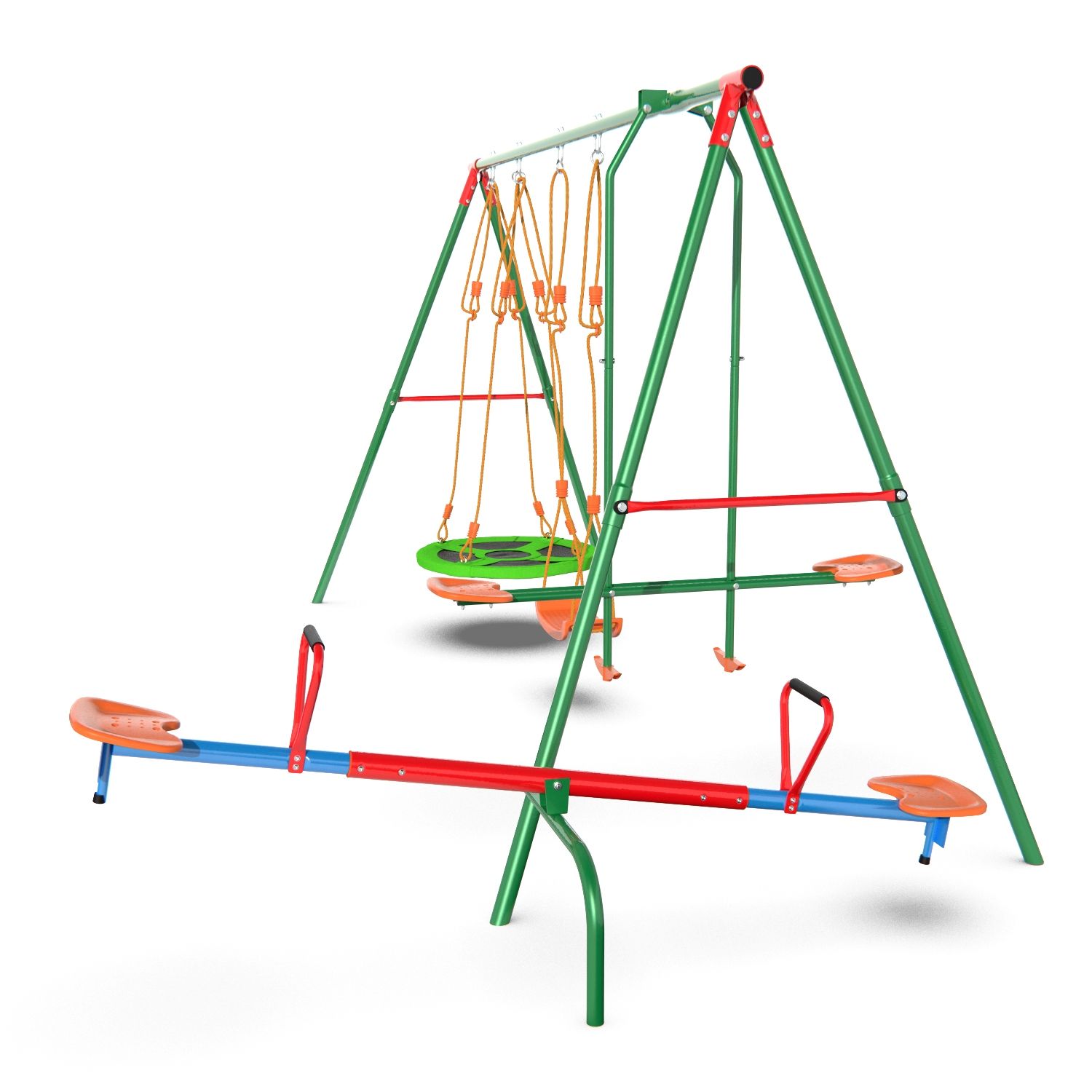 Установив игровой комплекс MSW-01 серии DFC Kids у себя на участке, вы всегда будете знать, чем занимается ваш ребенок, ведь это целый мини-парк аттракционов, в котором ребенок может выбрать то, что ему по душе, практически не выходя из дома. Комплекс предназначен для игр неболее 6 детей, поэтому имеет крупные габариты — его размеры в рабочем виде составляют 364×238×196 см, а вес — 38,5 кг. В комплект входят веревочные качели, планер, гнездо и балансир, рассчитанные на детей от 3 лет. Сиденья качелей изготовлены из устойчивого пластика и оборудованы сидушками из вспененного полиэтилена. Диаметр качелей-гнезда 76 см.  Опоры изготовлены из стального профиля 45×1,5 мм, верхняя труба — из профиля 50,8×2 мм, боковые ребра — 25,4×1,0 мм, благодаря чему конструкция выдерживает до 145 кг и обладает повышенной устойчивостью. Комплекс подходит для занятий детей от 3 лет. В комплекте с комплексом поставляются анкеры крепления к земле, повышающие устойчивость конструкции. Под каждый анкер выкопайте яму глубиной 60 см и залейте бетонным раствором 30x30x50 см (ДxШxВ). Воткните анкеры в раствор, пока он не застыл.