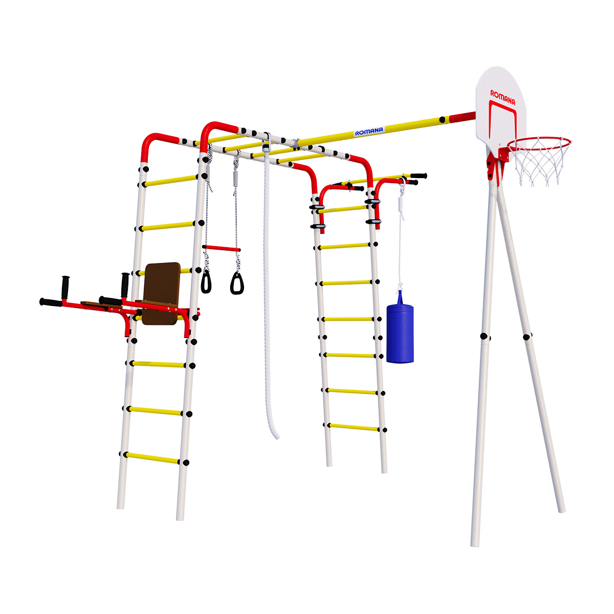 Дачный комплекс «Fitness» – это детский спортивно-игровой комплекс, который подойдет не только для дачного участка, но и для площадки в обычном дворе и для спортивной площадки в дошкольных и школьных заведениях. Модель Фитнесс дает ребенку начальную физическую подготовку, помогает развить ловкость и гибкость. В комплекте: турник подвижный, щит баскетбольный, канат, кольца гимнастические с перекладиной, брусья со спинкой, боксерский мешок, качели на выбор.