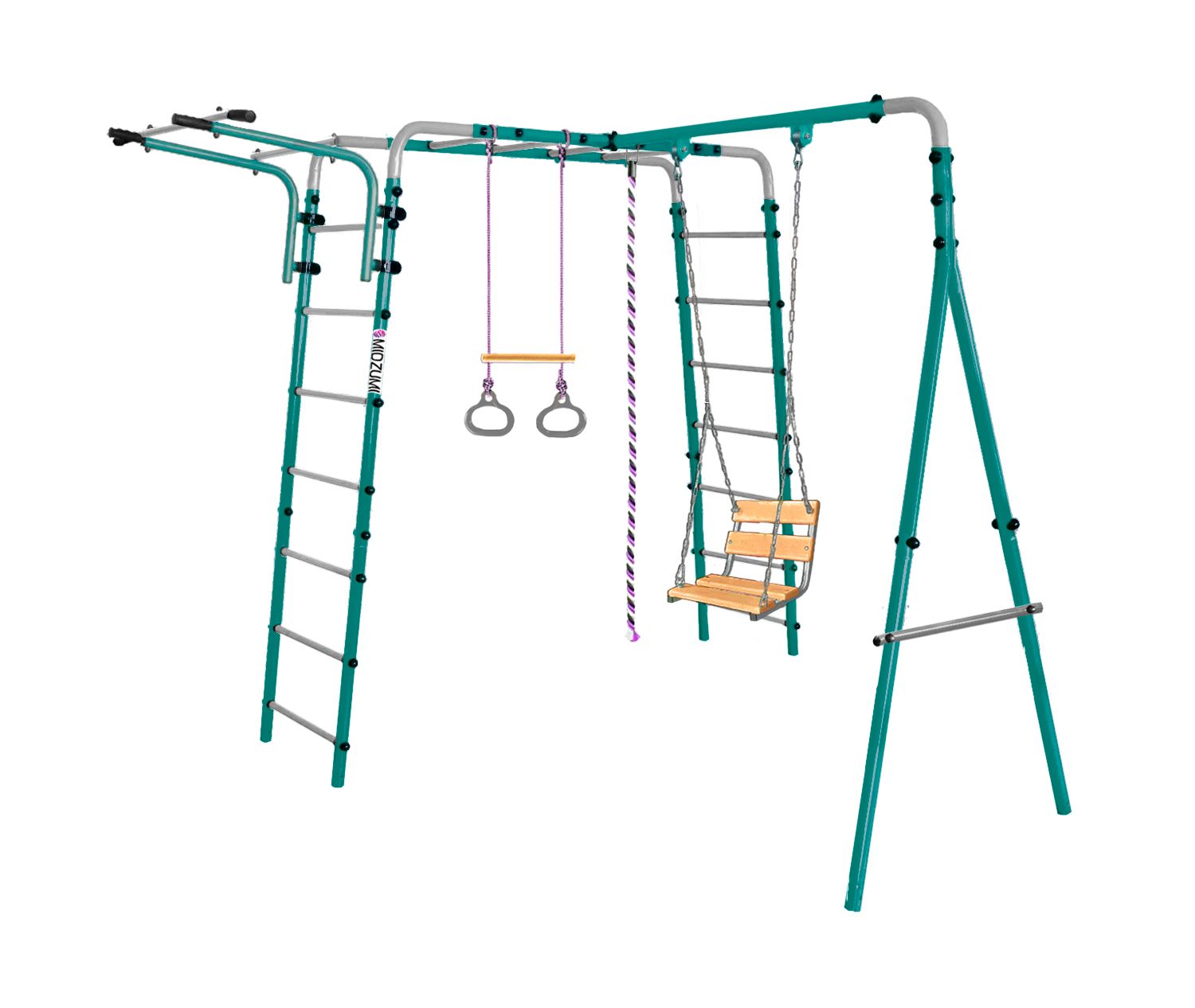 — Комплектация: каркас из металлических лестниц с рукоходом, турник, цепные качели со спинкой, канат, кольца с перекладиной.