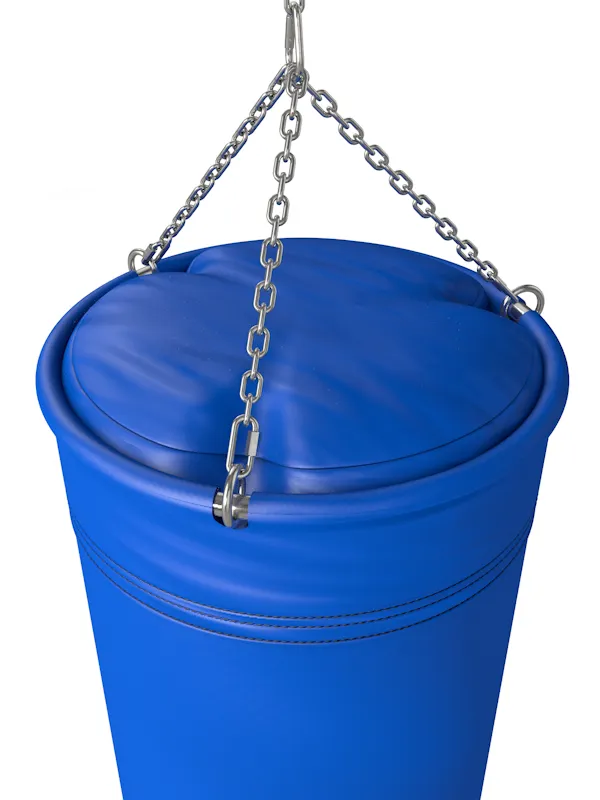Мешки боксерские из изготовлены из ППЭ, резиновой крошки, текстильной ветоши и тентовой ткани. Подвеска выполнена из металлические цепи, карабинов, которые крепятся за металлическое кольцо, вшитое в тент. Мешок не жесткий, а упругий, что предотвращает травмы во время тренировок.