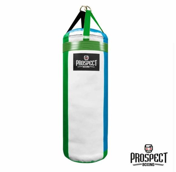 Боксёрский мешок бело-зелено-синий, с зелеными лямками и обручем. Боксёрский мешок, который при тренировке создает ощущение боя с реальным соперником. Изготовлен из лодочной ткани. Лодочная ткань – прочный, но мягкий на ощупь материал, который защищает от травм ваши кости и суставы при агрессивной работе по мешку.