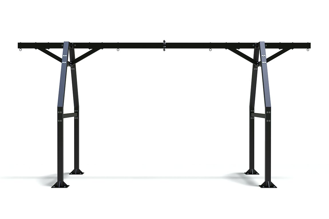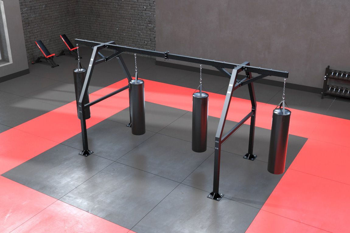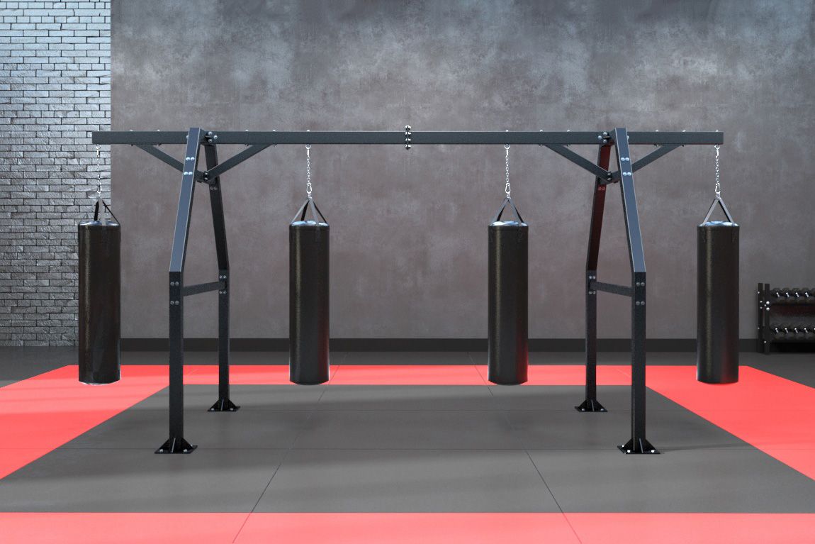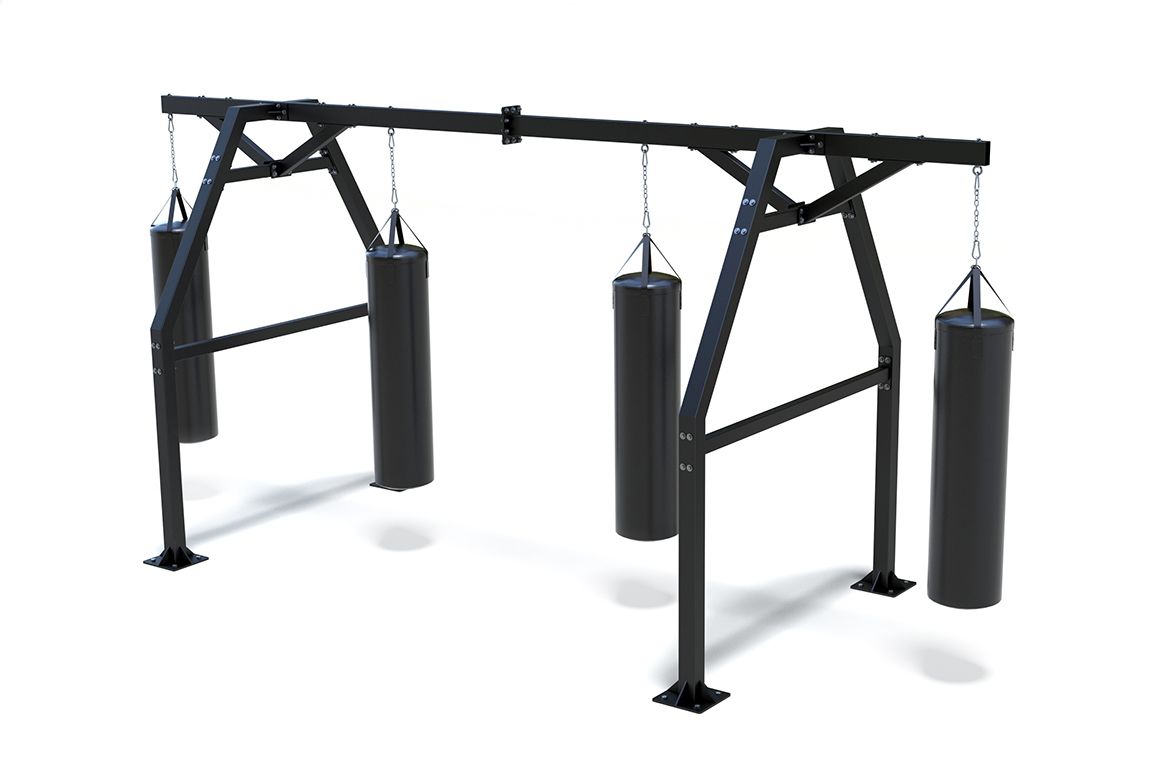 Изготовлена из толстостенного (толщина стенки 3 мм) металлического профиля. Стойка оборудована кронштейнами, к которым с помощью карабинов крепятся 4 боксерских мешка. Длина тренажера 6 м.