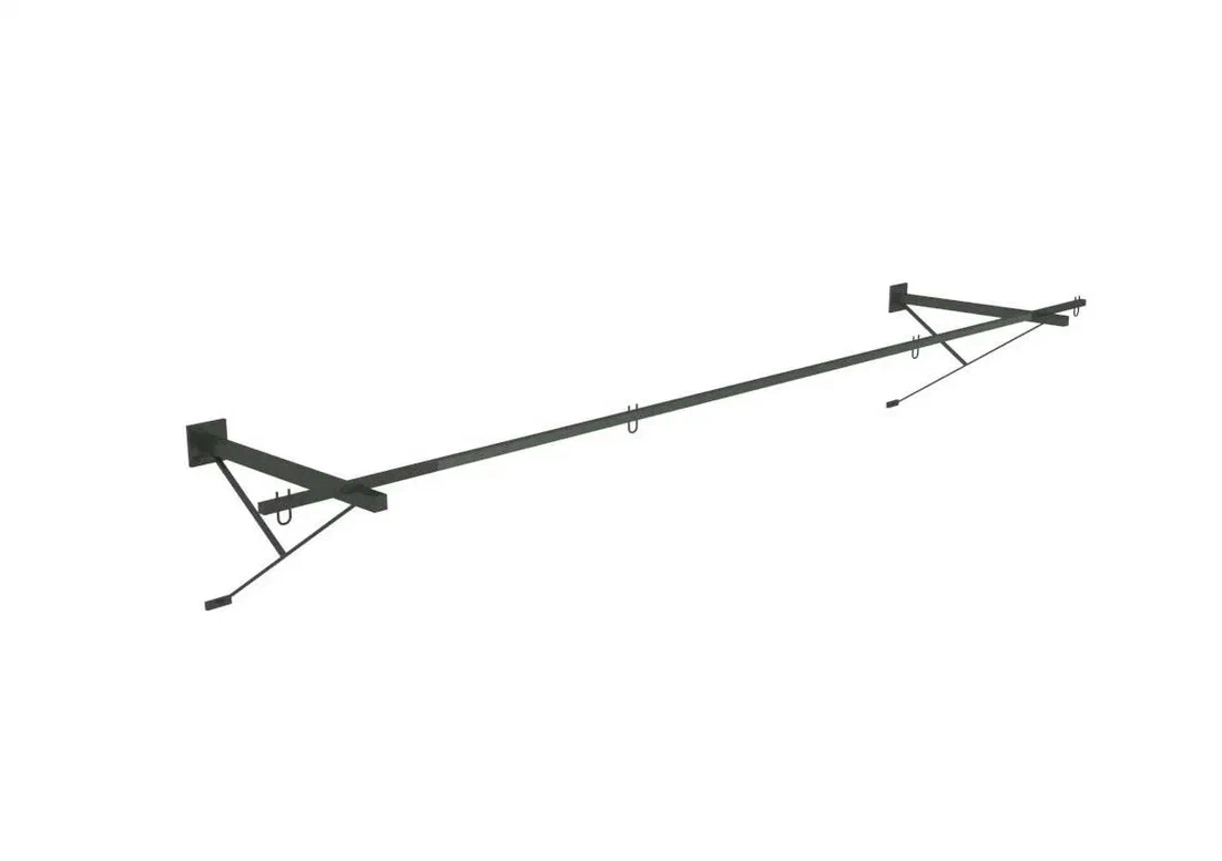 Изделие состоит из двух угловых кронштейнов, крепящихся к стене и перекладины с четырьмя скобами для подвески снарядов.