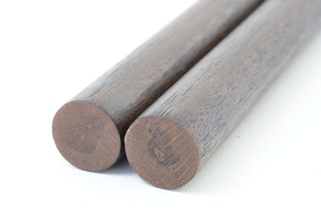 Дубовый поручень, тонированный в ореховый оттенок. Поры окрашены черной патиной.