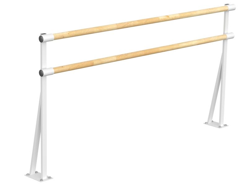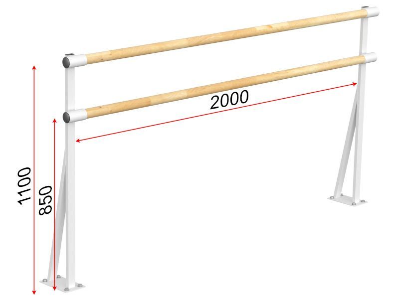 Двухрядный напольный балетный станок предназначен для установки в танцевальных и хореографических залах. Расстояние от пола до центров поручней 85 и 110 см, длина поручней 2 м, диаметр 47 мм, материал бук. Общий вес конструкции 10,3 кг. Балетный станок крепится к полу и к стене. В каждом кронштейне предусмотрены 4 отверстия для крепежа к полу. Вид крепежа зависит от конструкции пола.