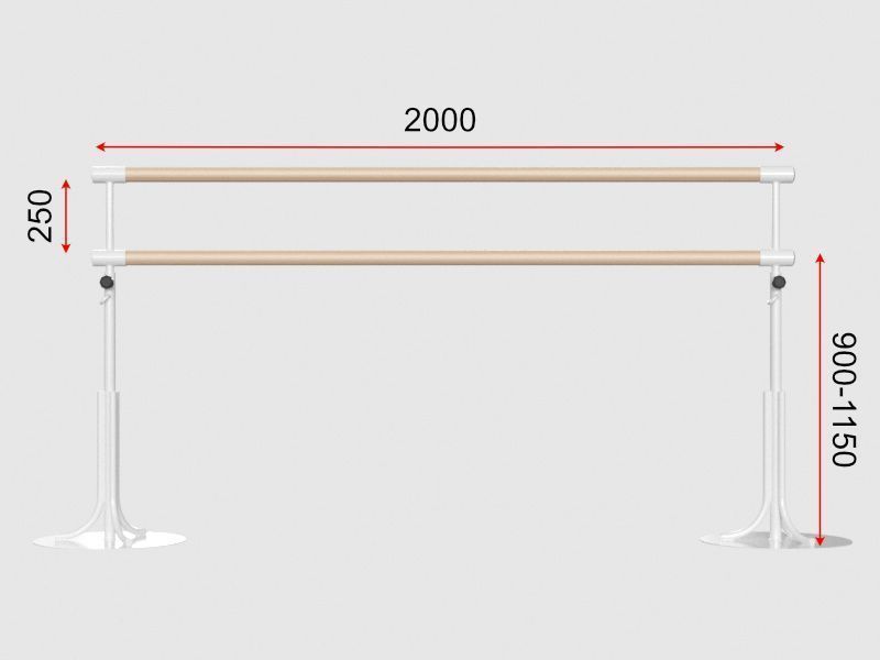 Длина поручня 2 м, диаметр 47 мм, материал - бук. Балетный станок мобилен, крепление к поверхности не требуется. В каждом кронштейне предусмотрены 2 отверстия для крепления поручня. Поверхность кронштейнов окрашена полимерным порошковым покрытием в камере полимеризации. Станок имеет регулировку высоты от 900 до 1150 мм.