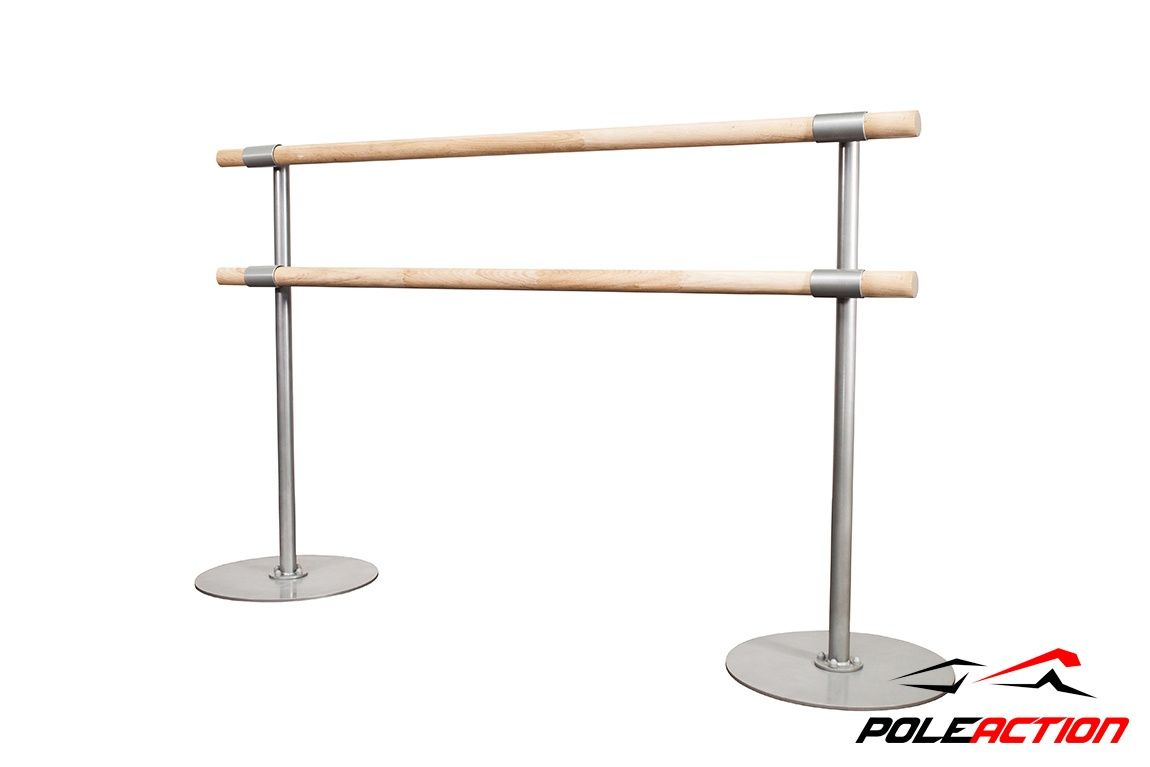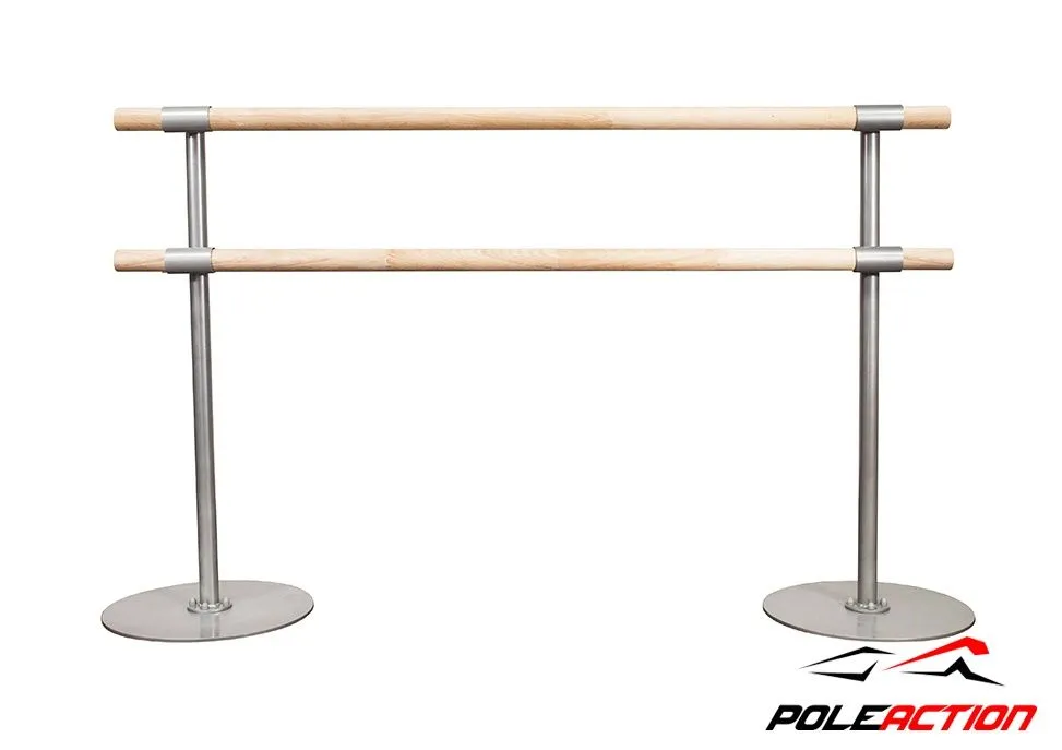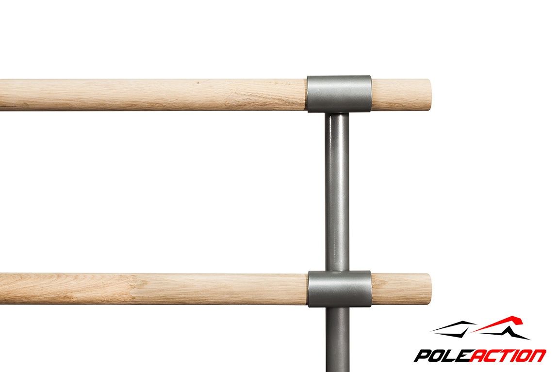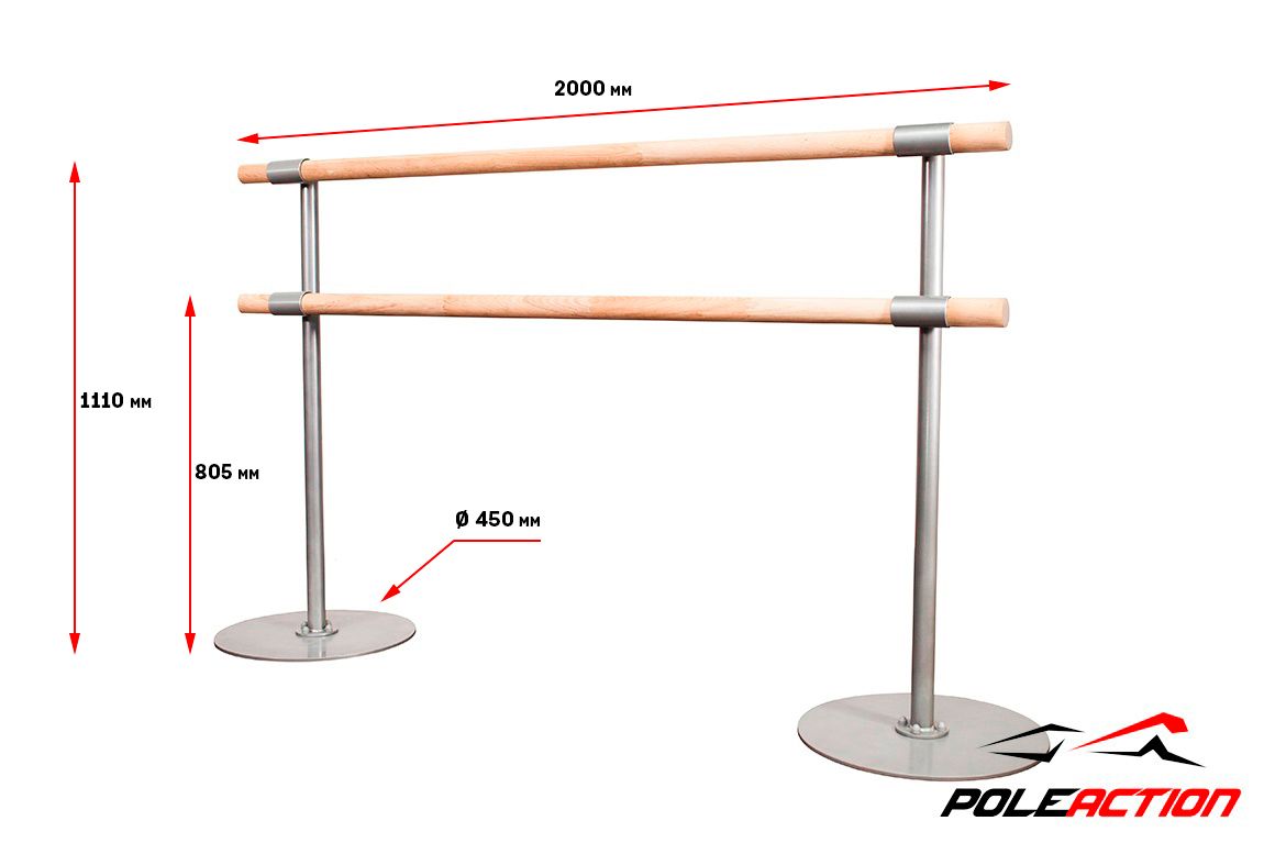 Высота нижнего поручня от пола составляет 75 см, высота верхнего поручня от пола составляет 110 см. Длина поручня - 2 метра. Это делает мобильный балетный станок универсальным как для начинающих, так и для профессионалов.