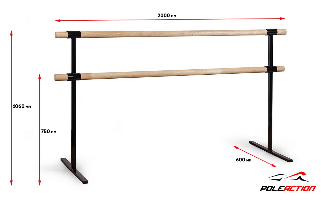 Высота нижнего поручня от пола составляет 75 см, высота верхнего поручня от пола составляет 110 см. Длина поручня - 2 метра. Это делает мобильный балетный станок универсальным как для начинающих, так и для профессионалов.
