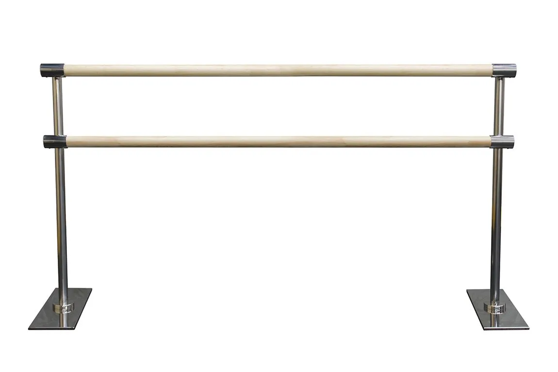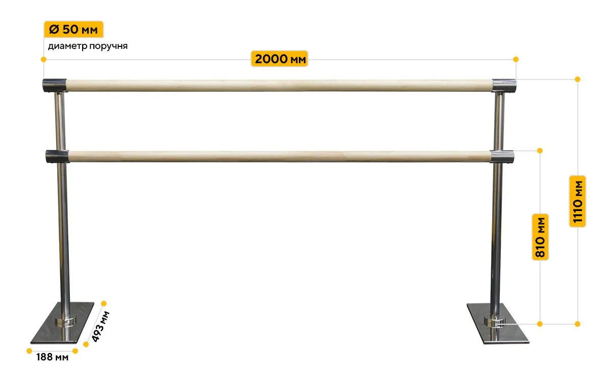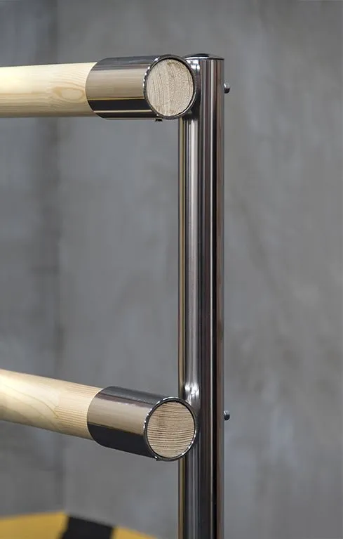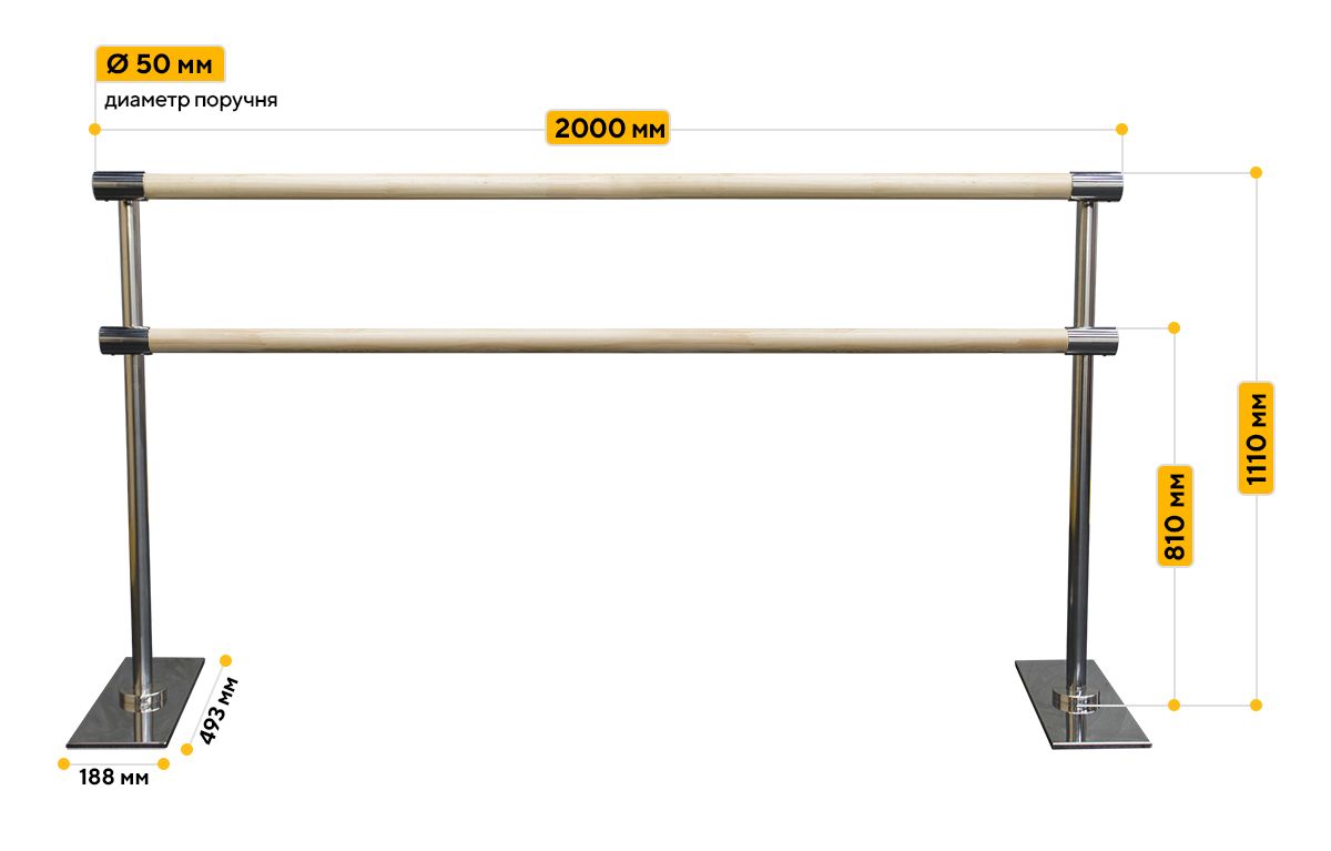 Высота нижнего поручня от пола составляет 81 см, высота верхнего поручня от пола составляет 110 см. Это делает мобильный балетный станок универсальным как для начинающих, так и для профессионалов. Различная длина поручня позволяет использовать хореографический станок в танцевальных классах любого размера. А возможность его перемещения по залу открывает возможность тренировки одновременно с двух сторон.