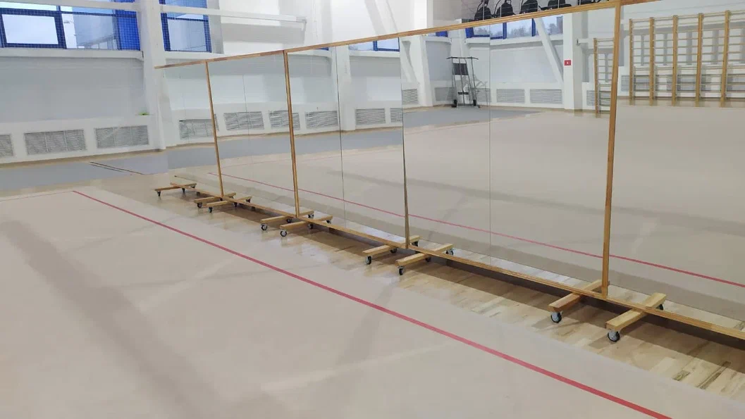 Каждая секция состоит из двух соединенных между собой мобильных деревянных рам с вклеенными и дополнительно закрепленными зеркалами. Общая площадь зеркал в одной секции - 8 кв. метров.