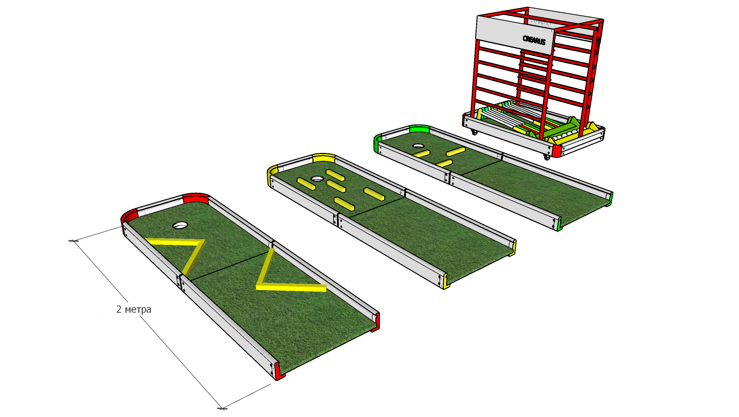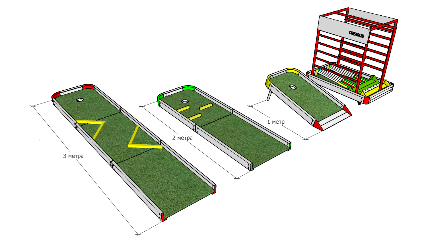 Три модульные дорожки для игры в мини гольф, Алюминиевый борт "Crearus" (порошковая окраска- по RAL), основание композитная панель 3 мм, игровая поверхность искусственная трава 8 мм (зеленая). В комплекте базовый комплект фигур (2 треугольника, 4 планки, 2 шайбы) Стойка для клюшек, клюшки, фигуры, мячи приобретаются отдельно