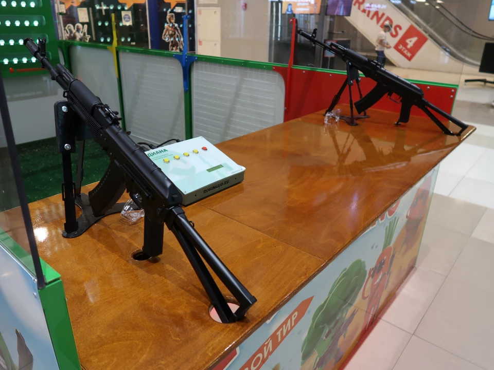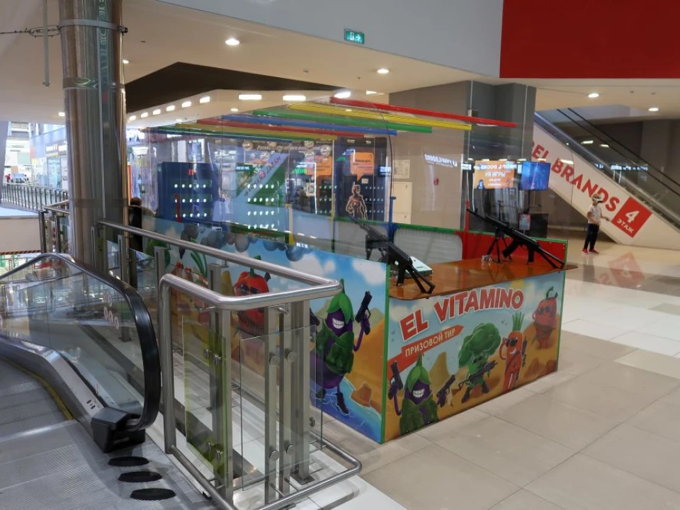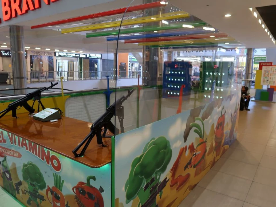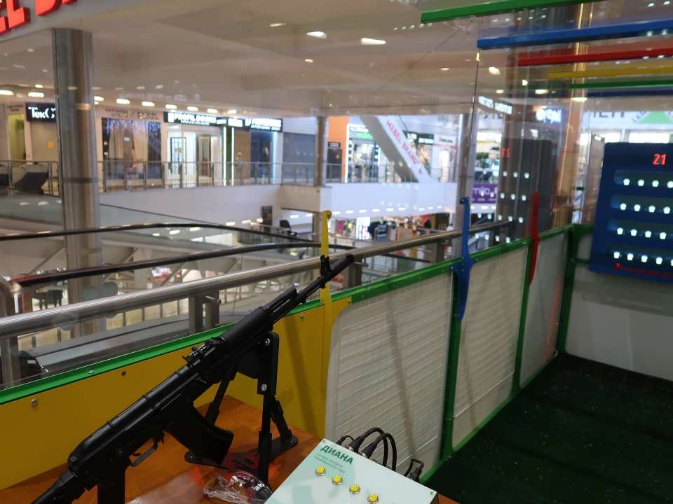 Купите тир с готовым сборным павильоном. Тир отлично встанет в торговом центре. Стены прозрачные и не мешают обзору. Со сборкой справитесь сами, инструкция прилагается!
