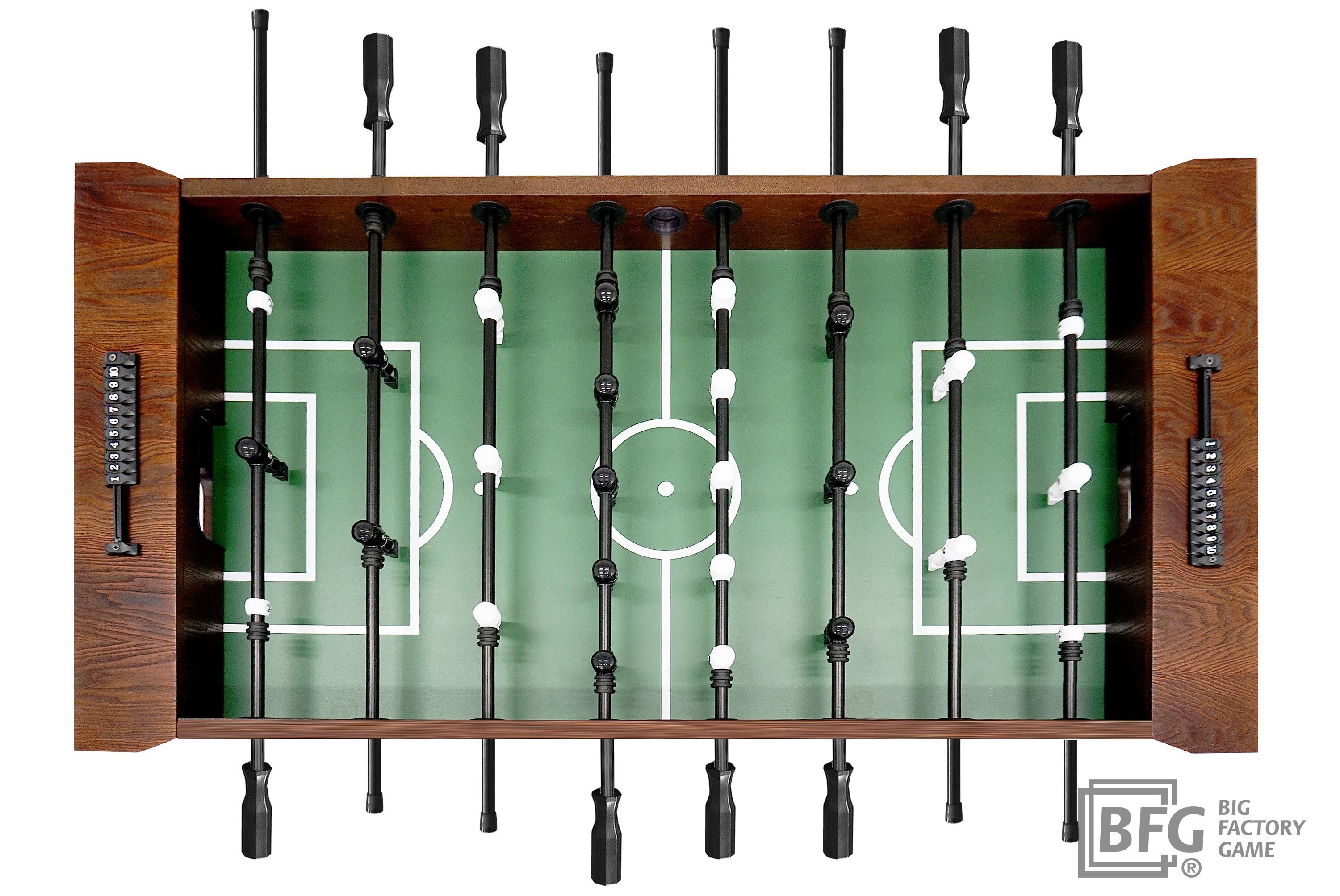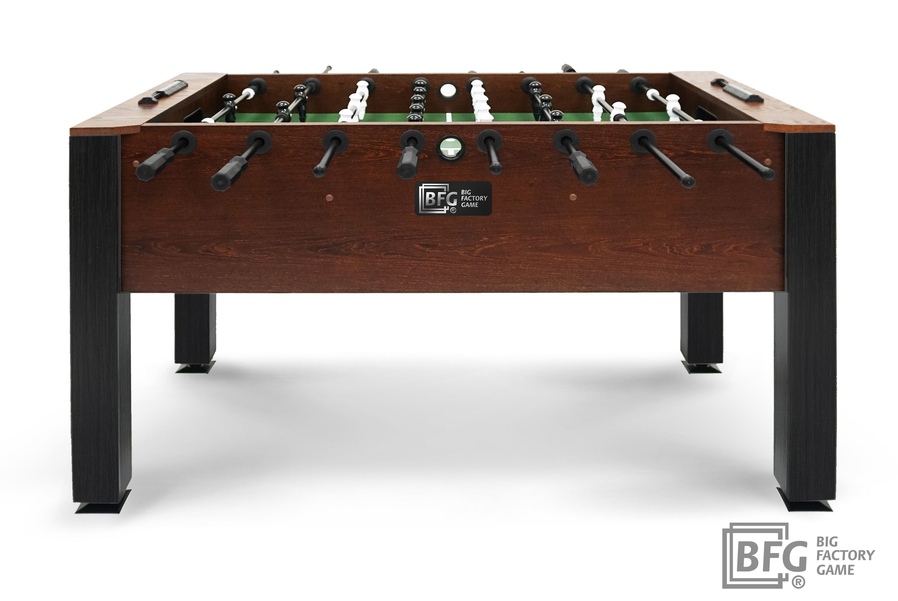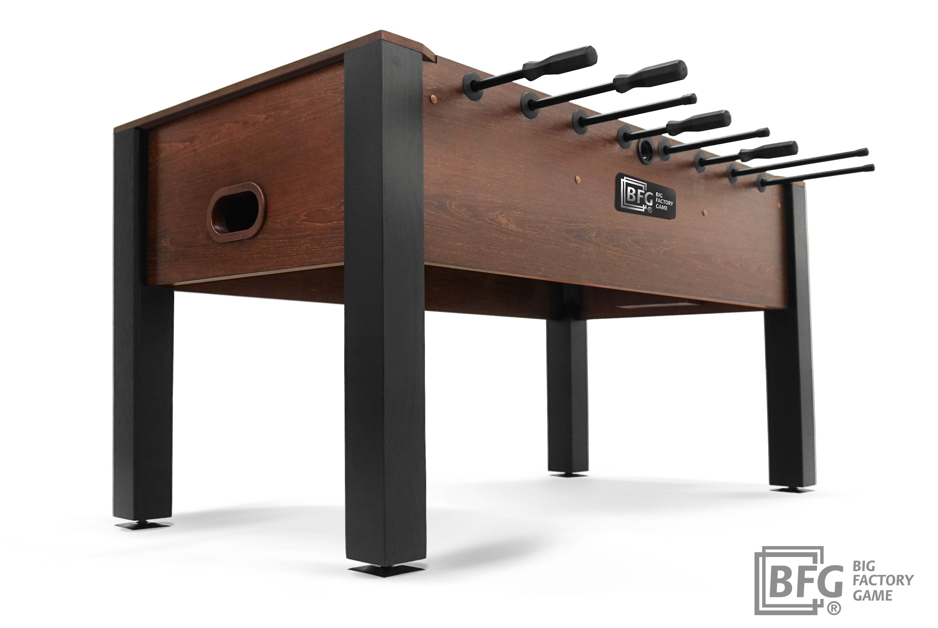Стол оборудован профессиональными штангами и стилизованными фигурками игроков, выполненными из долговечных и прочных материалов. Ключевым преимуществом модели является материал - стол изготовлен из натурального массива древесины с применением шпона ценных пород.