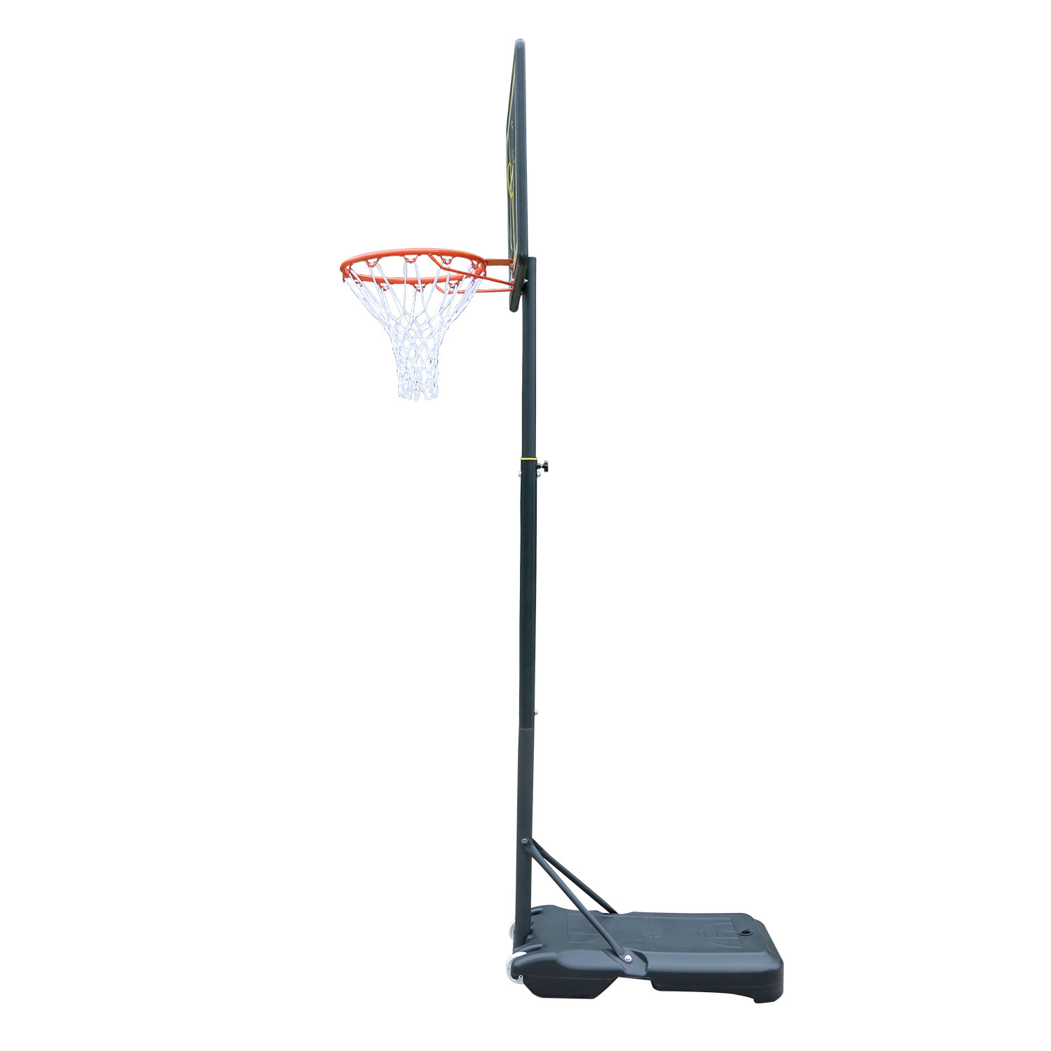 Детская мобильная стойка для игры в баскетбол. Для установки в помещении и на улице. В основание необходимо залить воду или засыпать песок. Телескопическая регулировка высоты от 165 до 210 см (по кольцу). Баскетбольное кольцо 38 см, цвет оранжевый. Всепогодная нейлоновая сетка в комплекте.