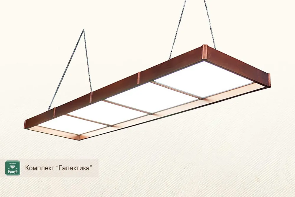 Комплект «Галактика» – это профессиональное энергосберегающее освещение бильярдного стола нового поколения. Каркас изготавливается из массива дерева и может быть окрашен в цвет бильярда. Встроенные светодиодные панели обеспечивают ровный световой поток, безопасный и комфортный для зрения игроков.