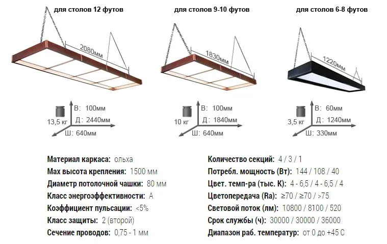 Количество секций и длина комплекта зависит от размеров бильярдного стола. Конструкция крепится на подвесных цепях, которые также помогут отрегулировать полноту освещения игрового поля вашего бильярда.