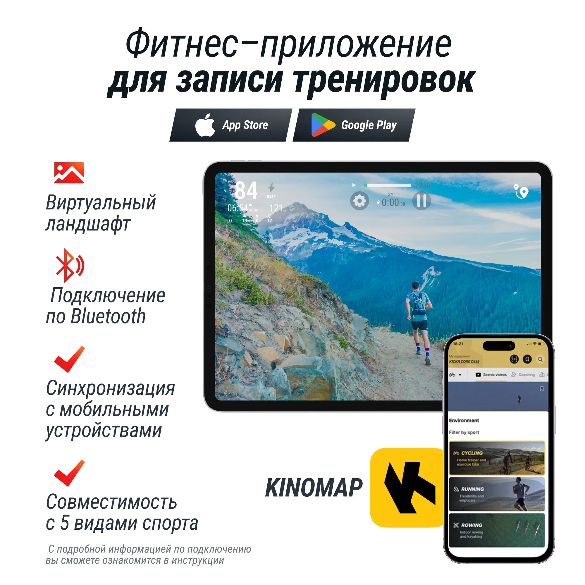 Большой LED экран 47,5 х 9,5 см с 4-мя окошками-стикерами отобразит текущие показатели времени, скорости, дистанцию и потраченные калории. Компьютер дорожки можно синхронизировать с популярными приложениями Kinomap (подключение через Bluetooth). В приложениях можно создать индивидуальный план тренировок, отслеживать прогресс и ставить новые фитнес-цели!