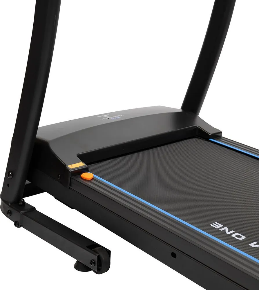 За движение отвечает надежный двигатель пиковой мощностью 2 л.с. постоянного тока. Скорость регулируется в диапазоне от 1 до 12 км/ч - на максимуме этого вполне хватает для бега начинающих и продвинутых спортсменов. Размеры бегового полотна составляют 112 см. в длину и 40 см. в ширину - обеспечивает комфорт и безопасность при ходьбе и беге на любых скоростях, включая максимальные. Угол наклона регулируется механически(вручную) и имеет три положения. Несмотря на сравнительно небольшие размеры бегового полотна, тренироваться на Titanium One Т30 Special blue может пользователь ростом вплоть до 190 см, но есть ограничение по максимальному весу пользователя - 120 кг. Если вес превышает это значение, следует обратить внимание на модели уровнем выше. Амортизация, настроенная на средний уровень жесткости, представлена 4-я резиновыми ножками системы Softwave+™ и двумя плоскими 2 плоских эластомерами EasyRubb™. Это базовая амортизация, она в состоянии погасить часть ударной нагрузки на суставы и минимизировать уровень шума. Для тренировки большинства пользователей не испытывающих проблем с суставами, при наличии качественной спортивной обуви уровень амортизации будет достаточным. За качество скольжения отвечает многослойное полотно Diamond™ толщиной 1,6 мм швейцарского бренда Habasit и парафинированная дека толщиной 15 мм. Для создания дополнительной мягкости лучше заниматься на ковре или специально предназначенном для этого полиуретановом коврике для фитнес оборудования.