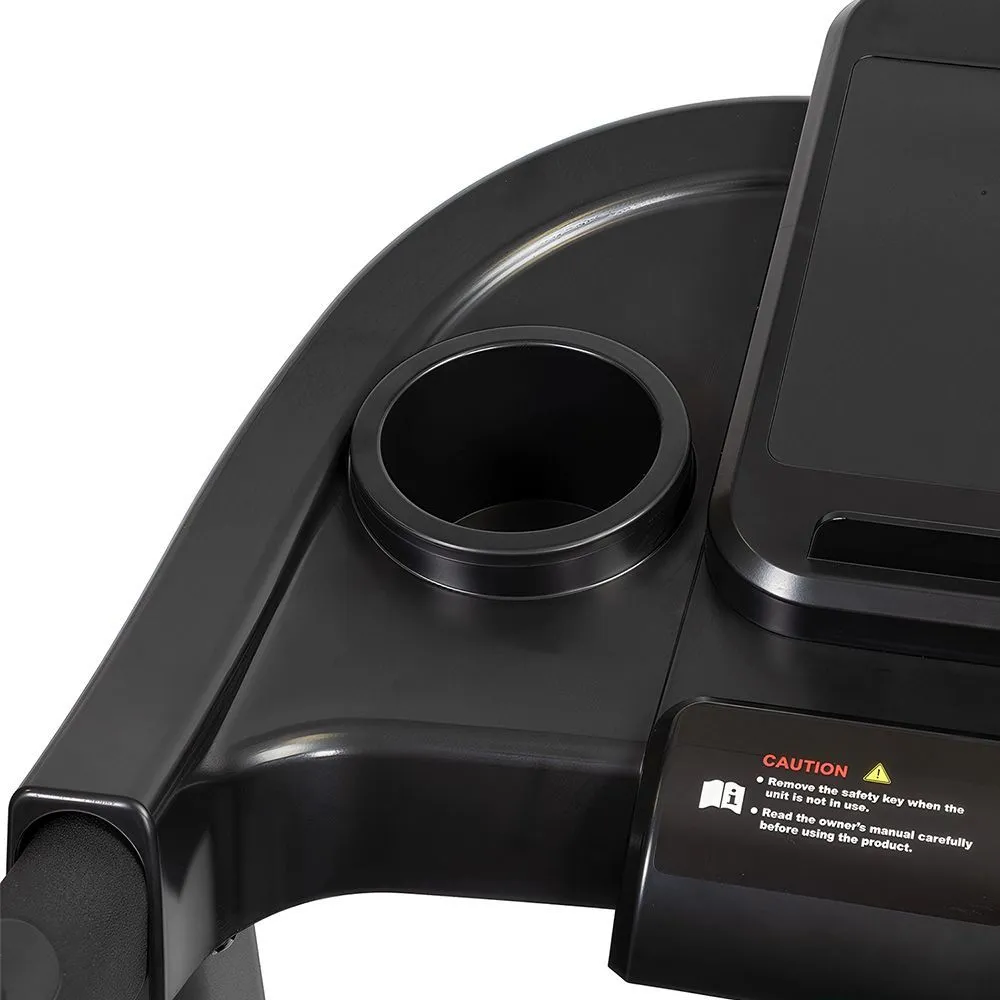 Тренировочный компьютер представлен синим многофункциональным дисплеем диагональю дюймов (7,6 см). На экран одновременно выводятся все основные параметры тренировки - время, скорость, дистанция, потраченные калории и пульс. В программный пакет входят 12 предустановленных программ, направленных на тренировку скоростных качеств, выносливости, укрепления сердечно-сосудистой системы и похудания. Помимо предустановленных программ, можно воспользоваться программами обратного отсчета дистанции, времени или затраченных калорий. Для считывания показаний пульса в поручни дорожки вмонтированы контактные сенсорные датчики. Благодаря быстрым клавишам управления на поручнях можно отрегулировать скорость, не снимая рук с поручней, а так же включить или выключить тренажёр. Разнообразить тренировку поможет мультимедийная составляющая - в консоль дорожки установлены колонки мощностью 3 ватта, а носителями аудио файлов выступают MP3-плеер или смартфон. Перемещение дорожки происходит за счет 2-х транспортировочных роликов.