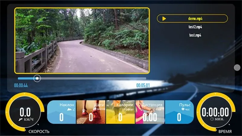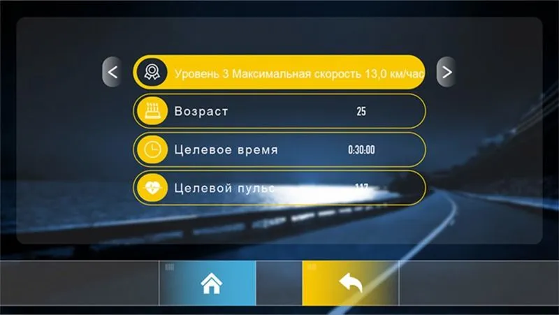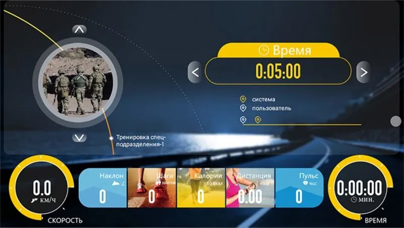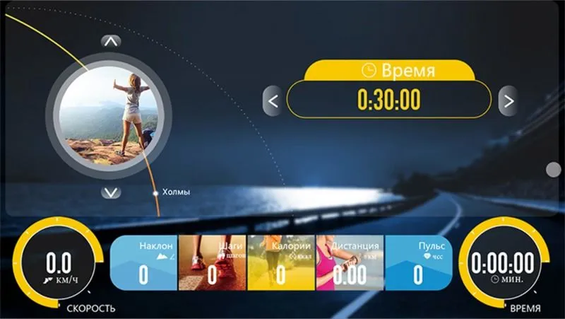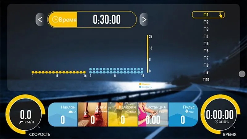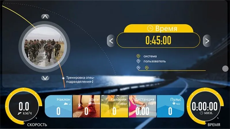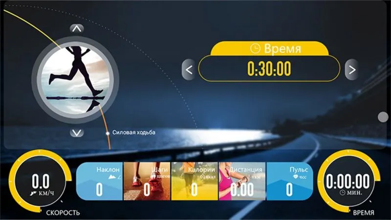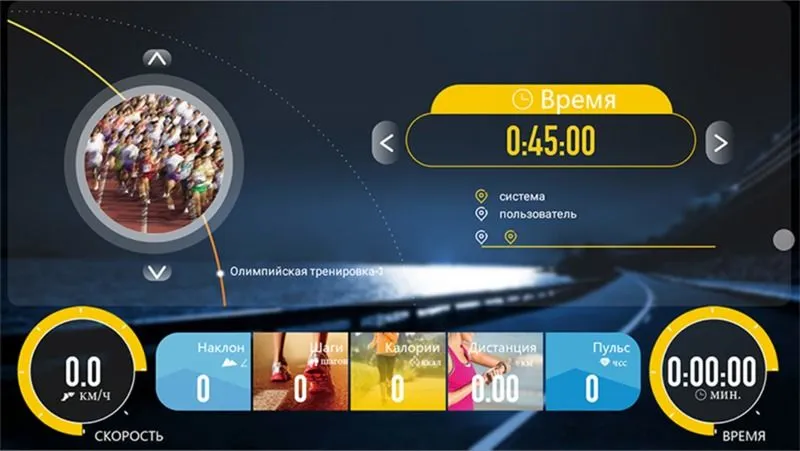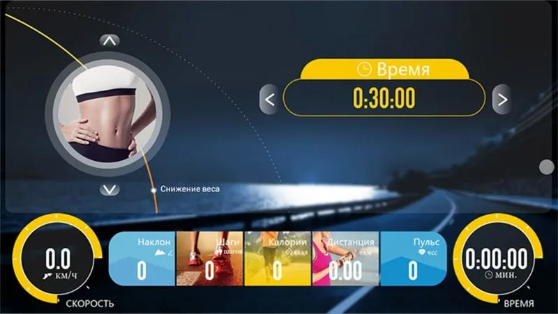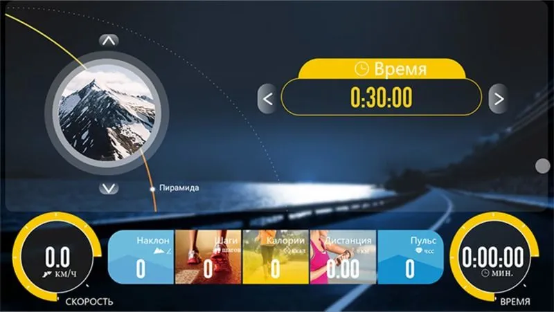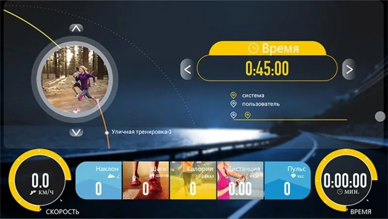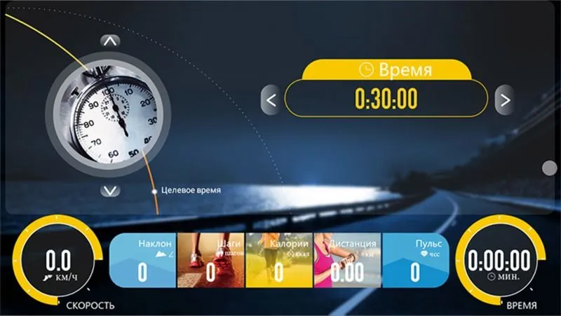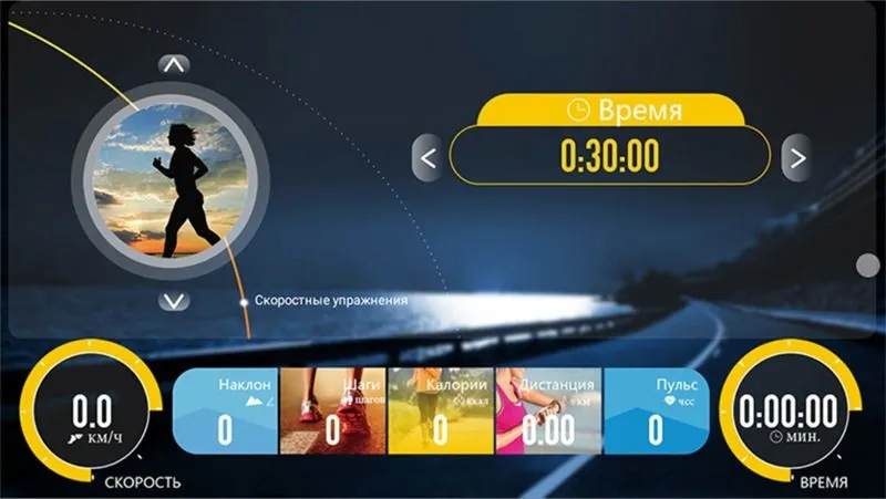 время тренировки / скорость / угол наклона / дистанция / калории / пульс / шаги / дата / часы |