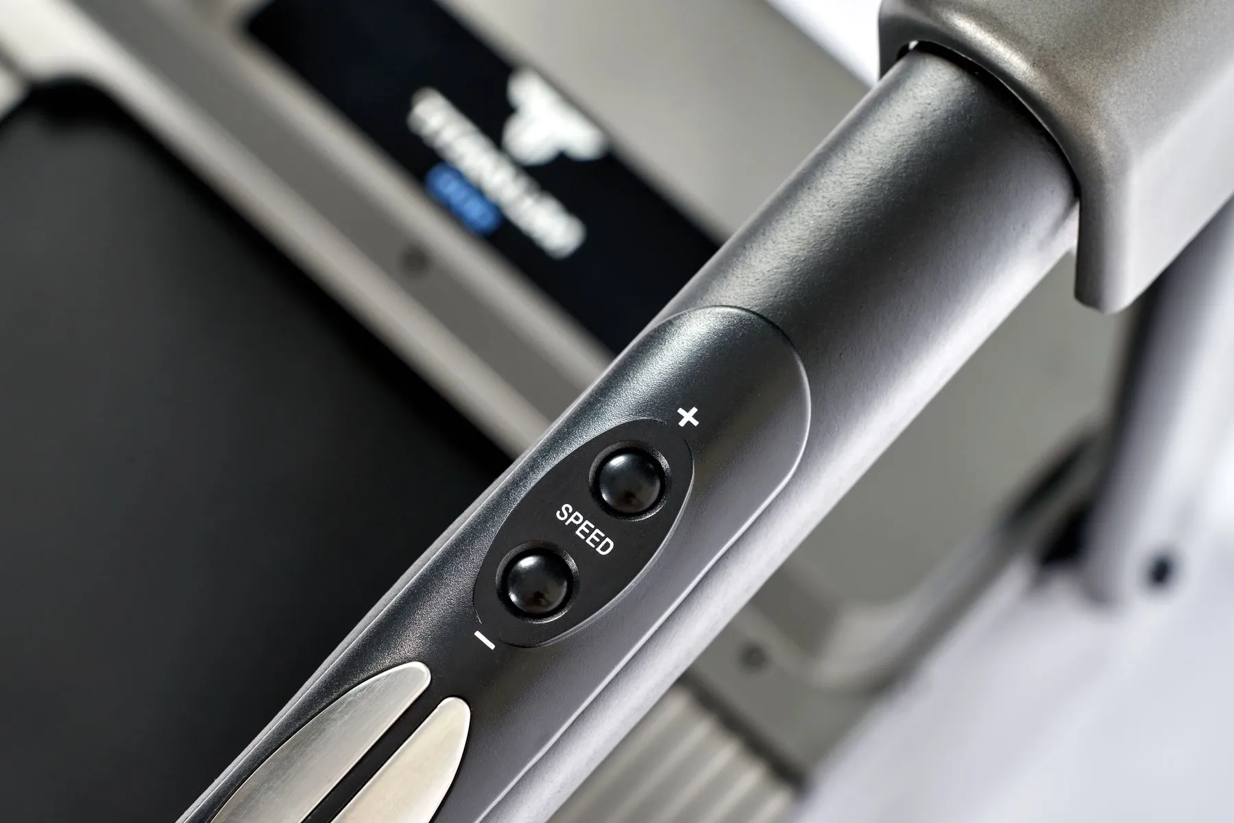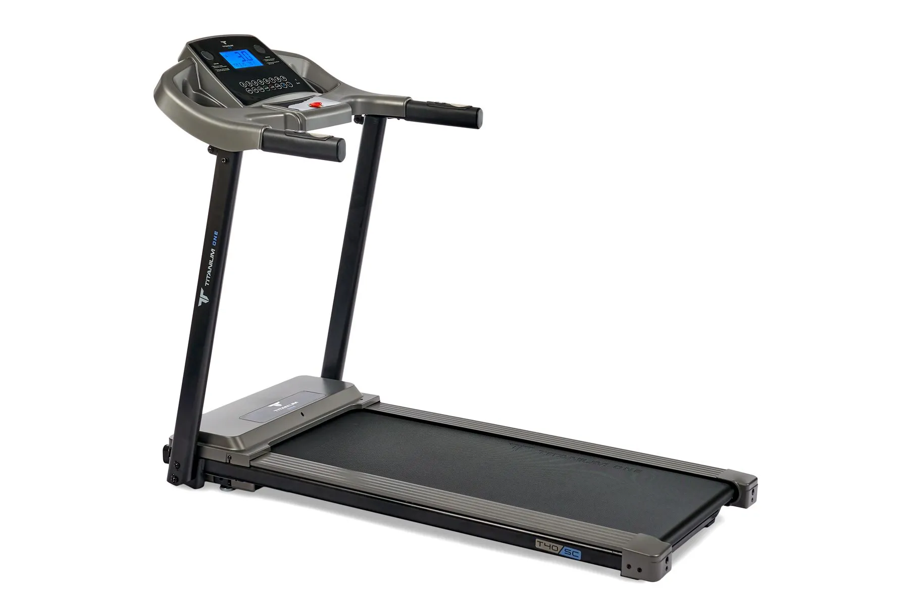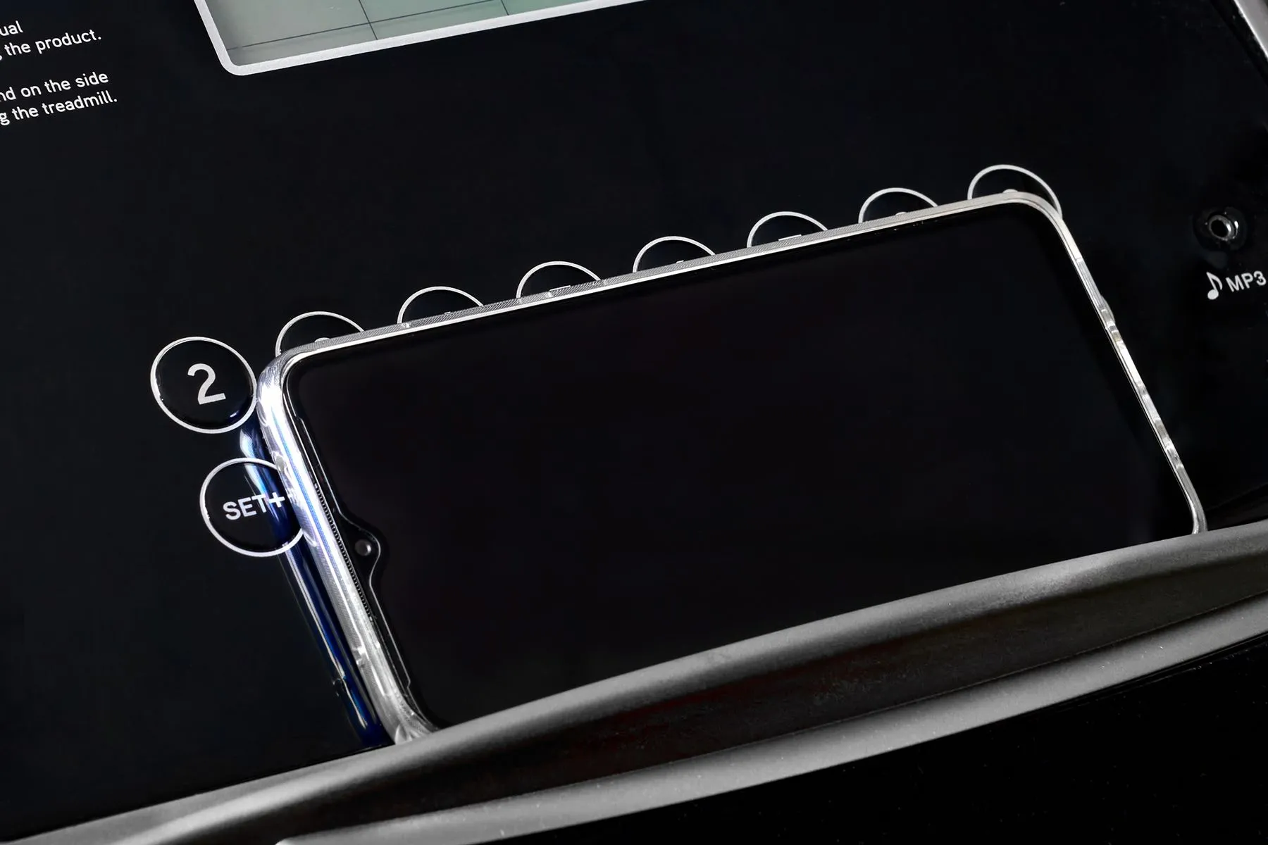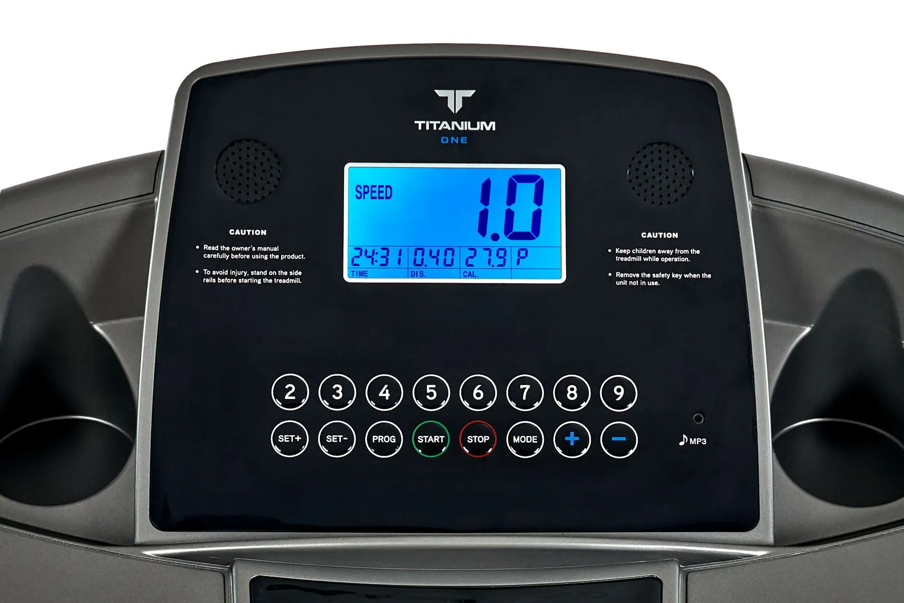 Тренировочный компьютер представлен голубым дисплеем диагональю 12,5 см. На экран одновременно выводятся все основные параметры тренировки - время, скорость, дистанция, потраченные калории и пульс. В программный пакет входят 12 предустановленных программ, направленных на тренировку скоростных качеств, выносливости, укрепления сердечно-сосудистой системы и похудания. Также можно воспользоваться одной из трех программ обратного отсчета (время, дистанция или калории). На поручнях находятся так называемые "быстрые клавиши" управления – благодаря им можно запустить или остановить тренажер, а также отрегулировать скорость. Здесь же, на поручнях, расположены сенсорные датчики пульса. На встроенные в консоль динамики можно вывести аудио файлы со своего смартфона. Небольшая, но приятная опция – подставка под телефон или смартфон. Во время тренировки можно включить фильм или сериал, это помогает отлично справиться с однообразием тренировок.