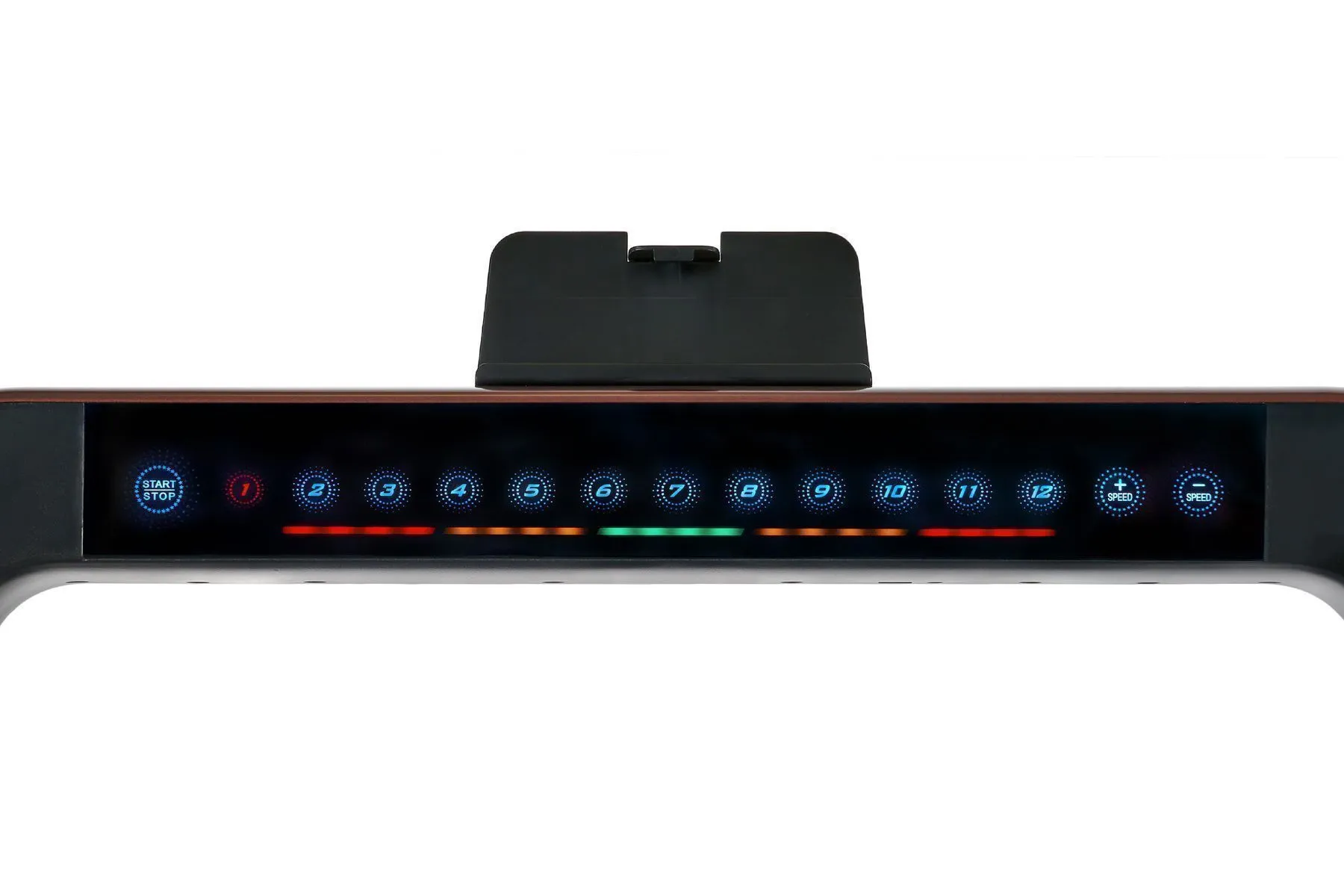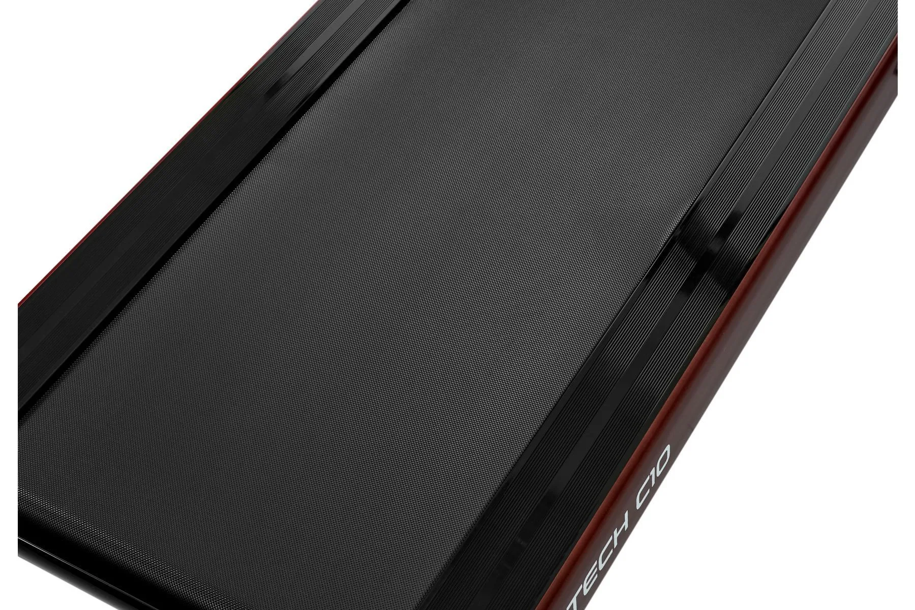 По своим характеристикам Slimtech C10 ориентирована на массовый сегмент пользователей начального и продвинутого уровня. Максимальная скорость составляет 12 км/ч, этого достаточно для большинства пользователей. Размер бегового полотна 112 на 40 см подойдет для комфортной тренировки. Современная система амортизации на основе 4 среднеразмерных эластомеров edge-V™ настроена на средний уровень жесткости. Тренировочный компьютер представлен двумя LED дисплеями – один на консоли, второй на кожухе моторного отсека. К числу передовых решений относится датчик присутствия пользователя. Дорожка остановится и выключится автоматически если тренирующегося нет на беговом полотне. Это опция используется для корректного отображения данных подключаемых приложений, где проводятся онлайн соревнования. В дорожку установлены колонки мощностью 3 Ватта, подключение мобильного устройства происходит по Bluetooth соединению.