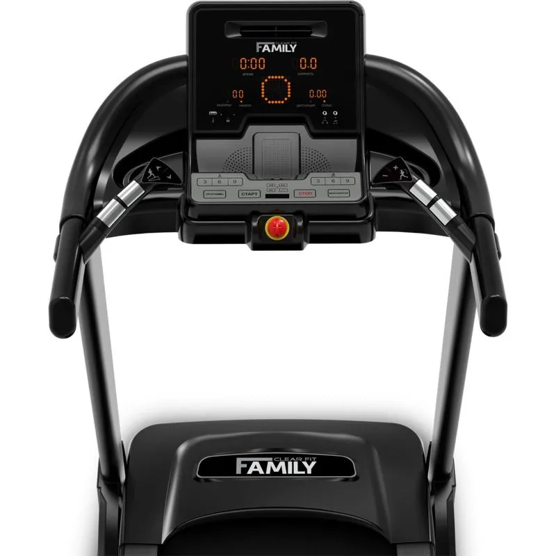 Русифицированная консоль и удобная клавиатура обеспечивают комфорт управления во время движения. Качественный и информативный дисплей с контрастной подсветкой, состоит из отдельных больших окон, отображающих все параметры тренировки. Предустановленный HRC модуль позволяет подключать беспроводной датчик пульса 5 кГц или использовать встроенные датчики пульса на поручнях. Пакет программ состоит из 34 тренировок, включая разноплановые предустановленные программы, кардиоваскулярные, пользовательские, целевые, программы «Ручной режим» и анализатор массы тела. Дополнительно консоль оборудована вентилятором, динамиками для воспроизведения MP3 файлов с носителей USB и SD, или через порт Audio IN, системой контроля смазки бегового полотна и функцией экономии энергии – «спящий режим».