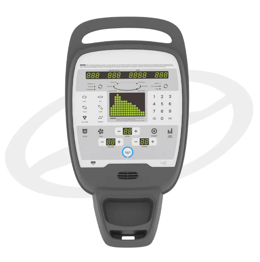 - Отображение на консоли: уровень сопротивления, скорость, число оборотов в минуту, калории, расстояние, время, пульс, график тренировки.