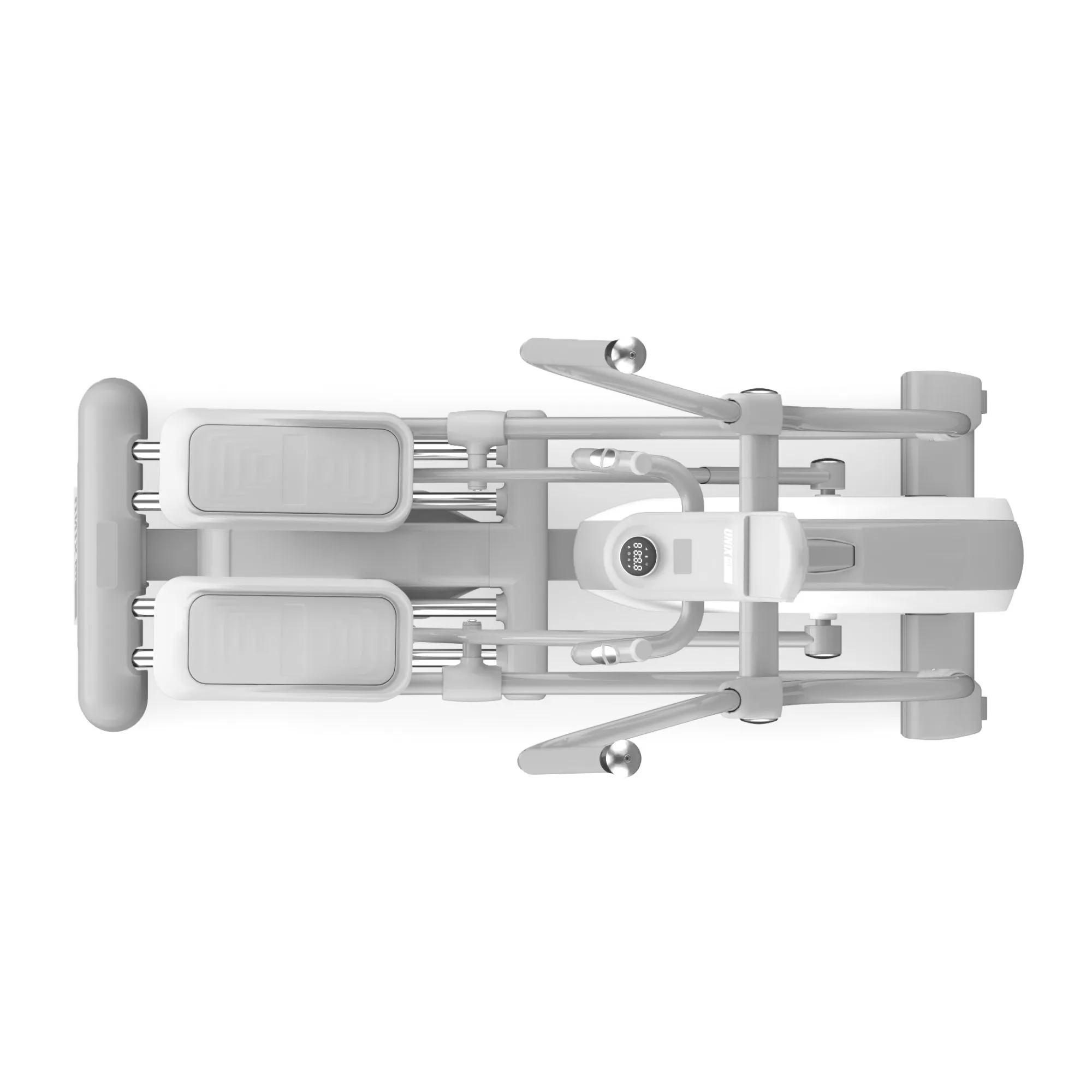 - Переднеприводная система. В эллиптическом тренажере UNIX Fit MV-850 маховик расположен спереди. Такая конструкция позволяет увеличить максимальную длину шага и обеспечивает естественное перемещение педалей. Благодаря высоко расположенным поручням, устройство подойдет пользователям любого роста.