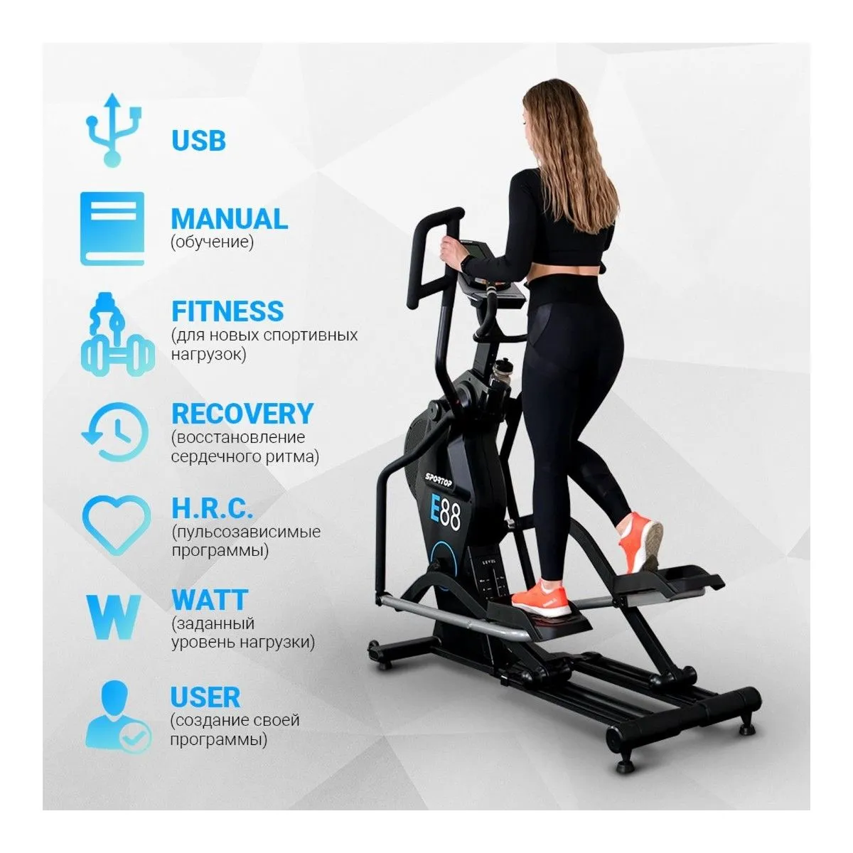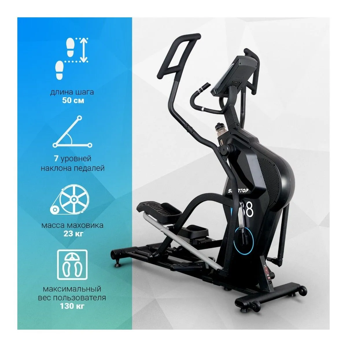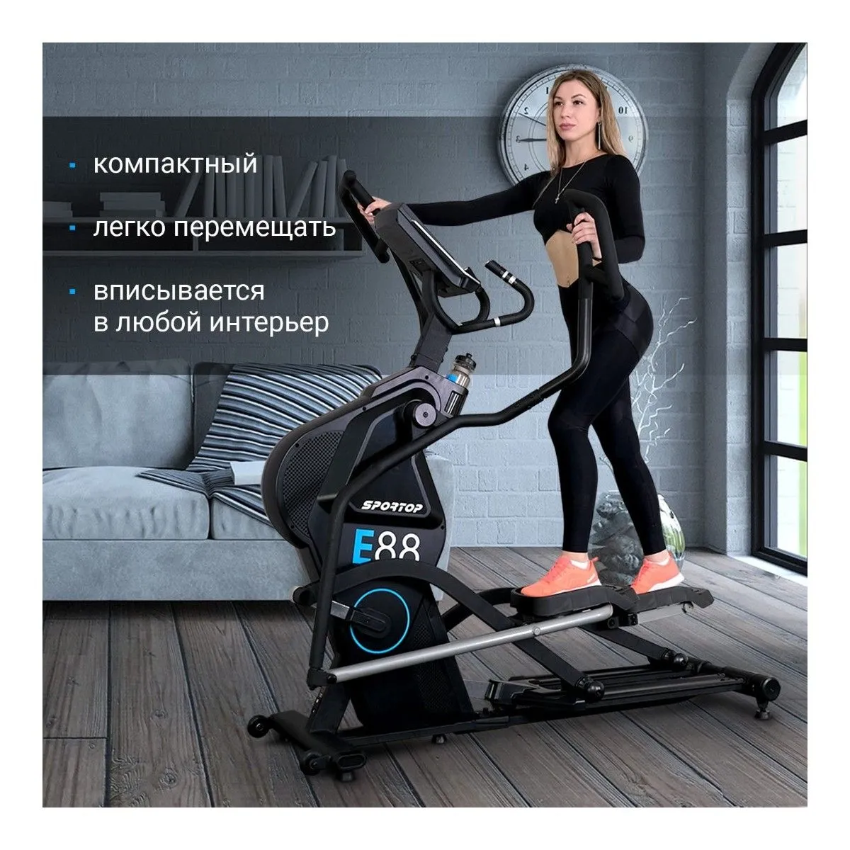 Эллиптический тренажер E88 от Sportop с улучшенным дизайном для интенсивных домашних тренировок. Занимаясь на нем, можно проработать мышцы ног, рук, спины, груди, бедер и ягодиц. Тренажер прекрасно впишется в любое пространство. Благодаря электромагнитной системе нагружения педали вращаются по эллиптической траектории плавно и бесшумно.