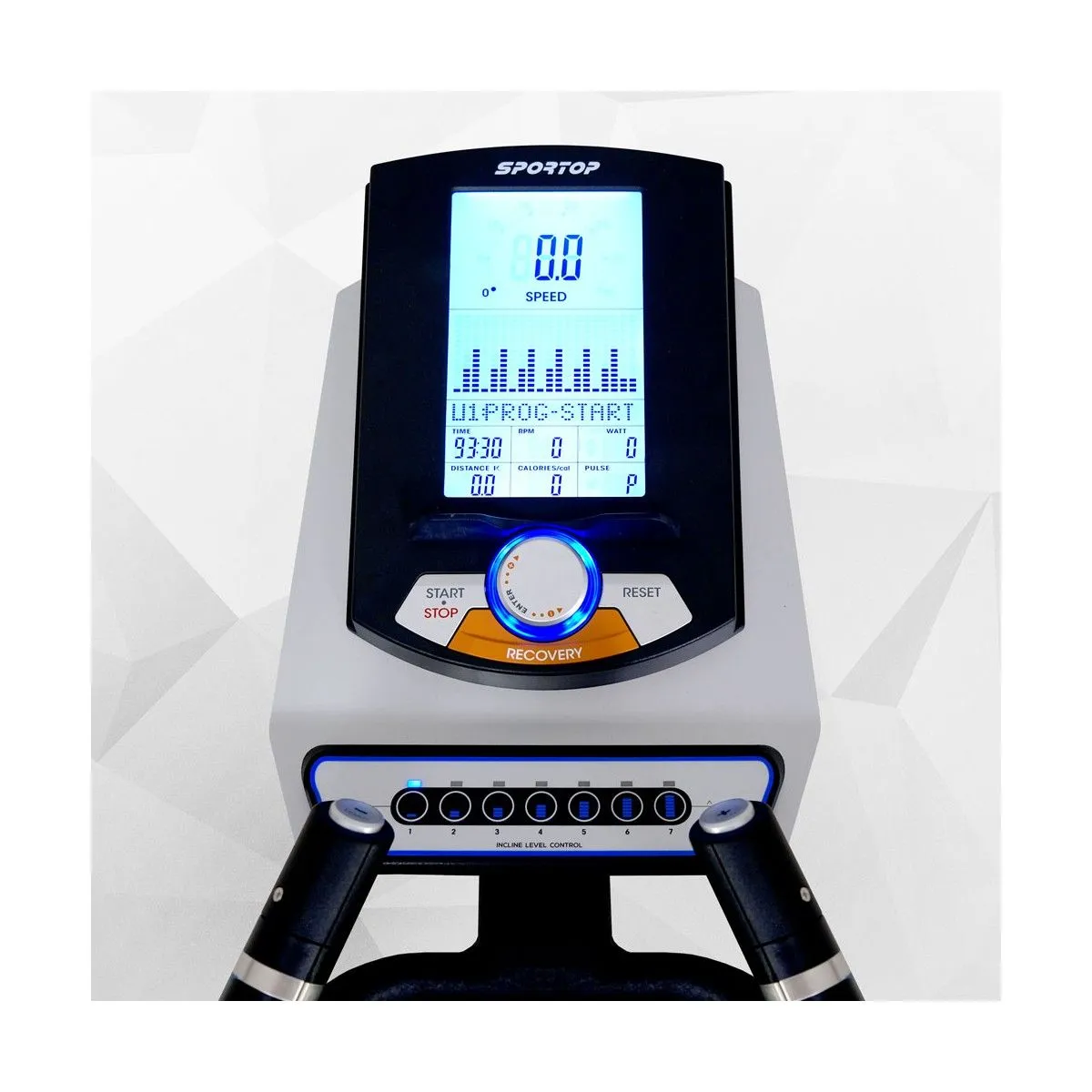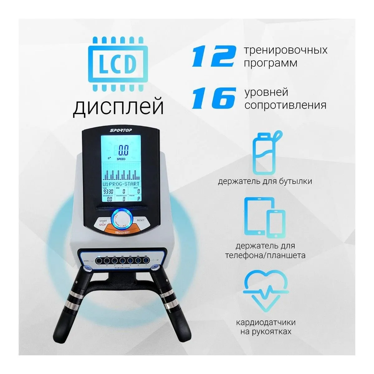 Следите за ходом тренировки с помощью LCD-дисплея. На нем отображаются скорость, время, расстояние, потраченные калории, пульс.