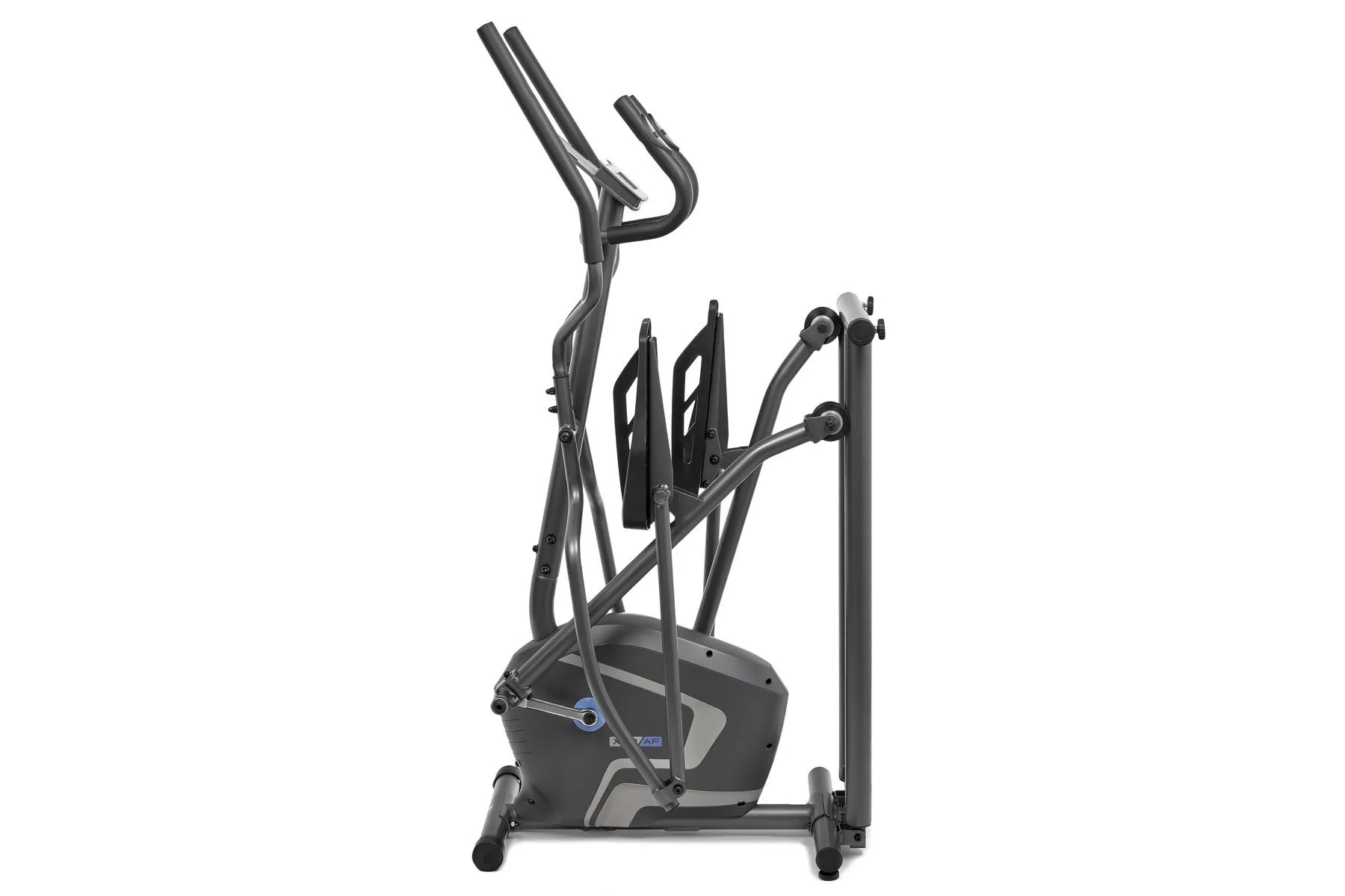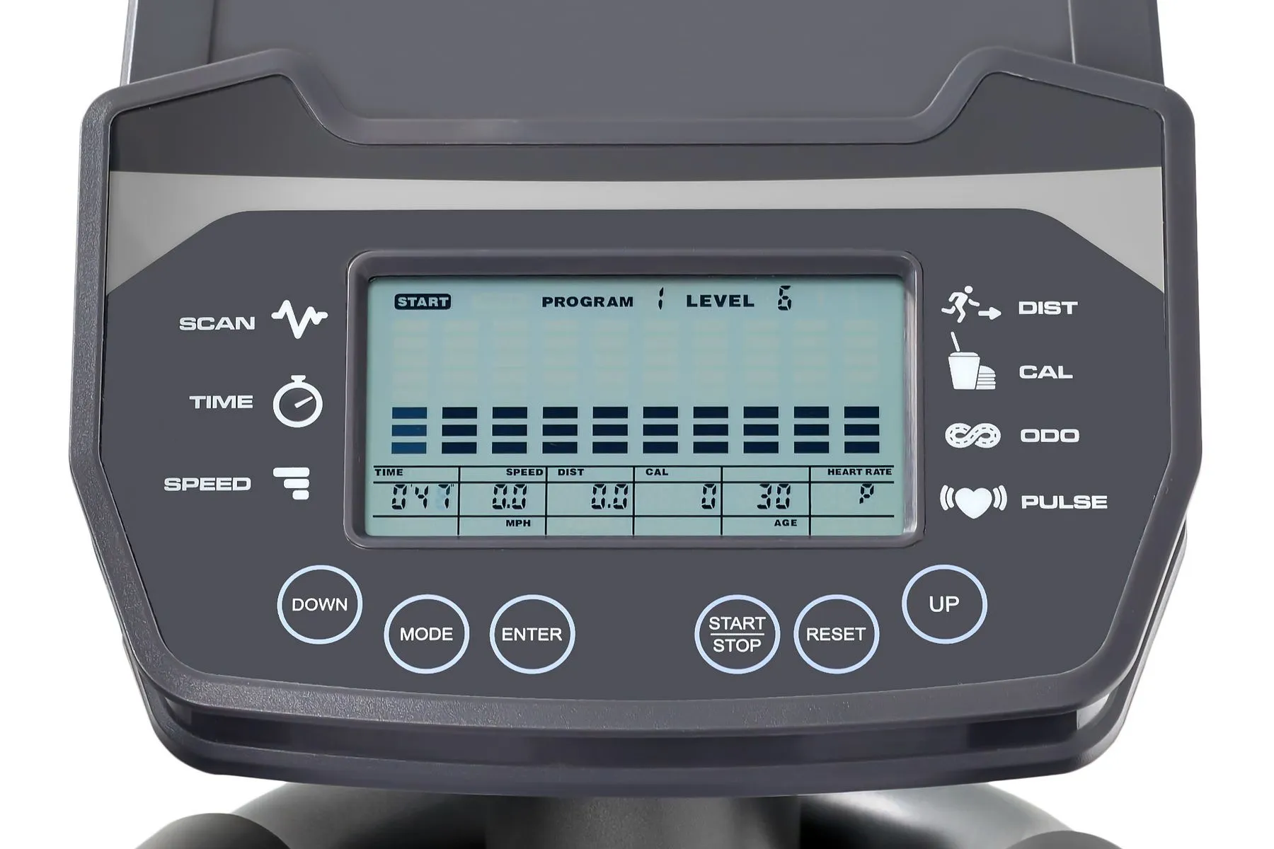 Тренировочный компьютер представлен черно-белым LCD-дисплеем с удобной подставкой под смартфон или планшет. На экран выводятся все основные параметры тренировки – программный профиль, время, дистанция, скорость, калории, уровни нагрузки, обороты в мин. и пульс. 12 предустановленных программ рассчитаны на тренировку скоростных качеств, выносливости, укрепления сердечно-сосудистой системы и похудания. Нагрузка регулируется электронным способом через консольные клавиши в 16 положениях. Измерение пульса происходит путем удержания ладоней на сенсорных датчиках пульса, расположенных на поручнях. К числу дополнительных характеристик эллипсоида относятся такие опции как транспортировочные ролики и компенсаторы неровностей пола. Переместить изделие из одного места в другое не составит большого труда, а компенсаторы позволят отрегулировать положение ножек на неровной поверхности.