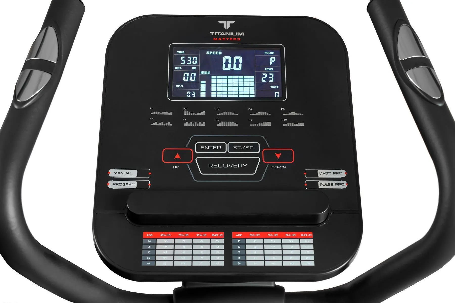 программный профиль, уровни нагрузки, время, дистанция, скорость, калории, обороты в мин., пульс, ватты, фитнес-тест (Recovery) |