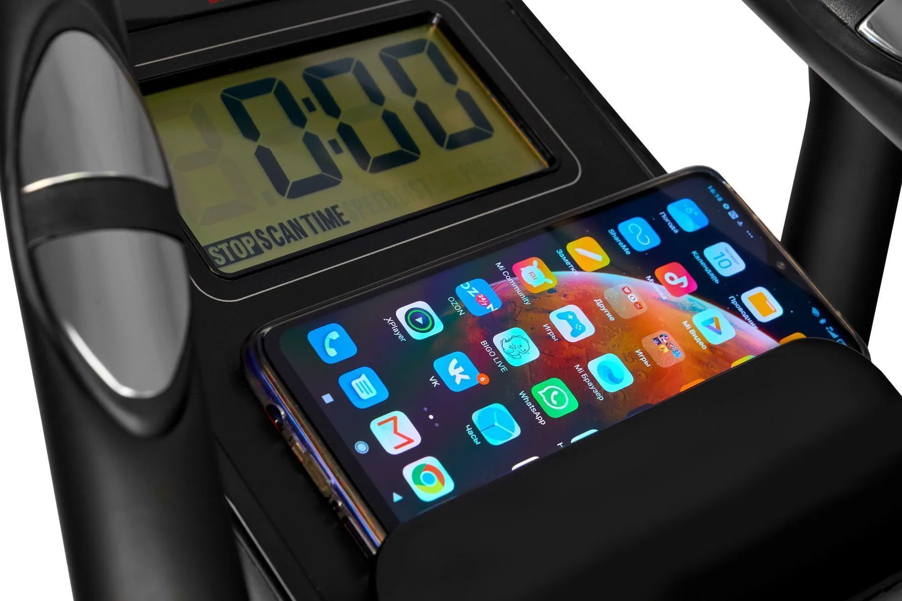 Тренировочный компьютер представлен черно-белым LCD-дисплеем диагональю 5 дюймов (12,7 см). На экран выводятся все основные параметры тренировки - время, дистанция, скорость, калории, обороты в мин. и пульс. Измерение пульса происходит путем удержания ладоней на сенсорных датчиках пульса, расположенных на поручнях. Нагрузка регулируется механическим путем в 8 положениях. К числу дополнительных характеристик эллипсоида относятся такие опции как транспортировочные ролики и компенсаторы неровностей пола. Переместить изделие из одного места в другое не составит большого труда, а компенсаторы позволят отрегулировать положение ножек на неровной поверхности.