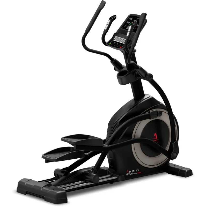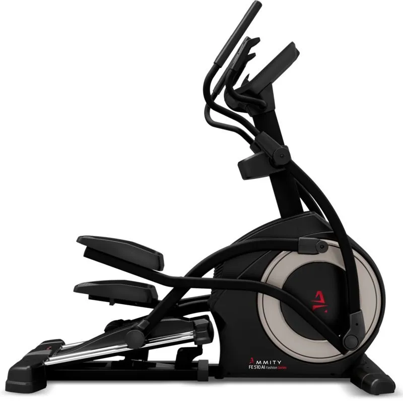Эллиптический эргометр AMMITY FE 510 AI — топовая модель серии Fashion, оснащен электрическим подъемом рампы для разноплановых и интенсивных тренировок, подходит для пользователей с любым уровнем подготовки. Надежный и высококачественный тренажер на мощной цельной раме, рассчитан на эксплуатацию пользователями до 180 кг. Прочный двойной алюминиевый трек и прорезиненные ролики гарантируют стабильность и тишину хода, конструктивно исключено соскальзывание педали с трека. Электрическое изменение наклона поднимает трек от 0 до 10 уровней, расширяет вариативность тренировок, меняет акцент нагрузки, увеличивая эффективность занятий и позволяет максимально глубоко прорабатывать все группы мышц, также индивидуально адаптирует тренажер, обеспечивает наиболее удобное положение спортсмена в зависимости от комплекции и спортивной подготовки. Основное преимущество этой серии в качественной эргономике и параметрах шага. Классический, глубокий шаг длиной 510 мм, оптимальная высота шага 200 / 210 / 220 мм, минимальный Q-фактор — 27 мм, создают лучшую траекторию движения для высокой продуктивности занятий и полной безопасности суставов. Плавный, мягкий ход, равномерное сопротивление и правильная посадка на тренажере обеспечивают комфорт даже при длительных интенсивных занятиях. Комфорт и высокая эффективность достигнуты благодаря продуманной конструкции, эргономике поручней, использованию новых технологий, применению высококлассных коммерческих комплектующих и подшипниковых соединений. Качественная заводская сборка гарантирует долгий срок эксплуатации, предоставляется гарантия 3 года. Надежная конструкция и тяжелая рама — это безопасность и комфортное размещение в диапазоне роста от 160 до 215 см, без ограничения возраста.