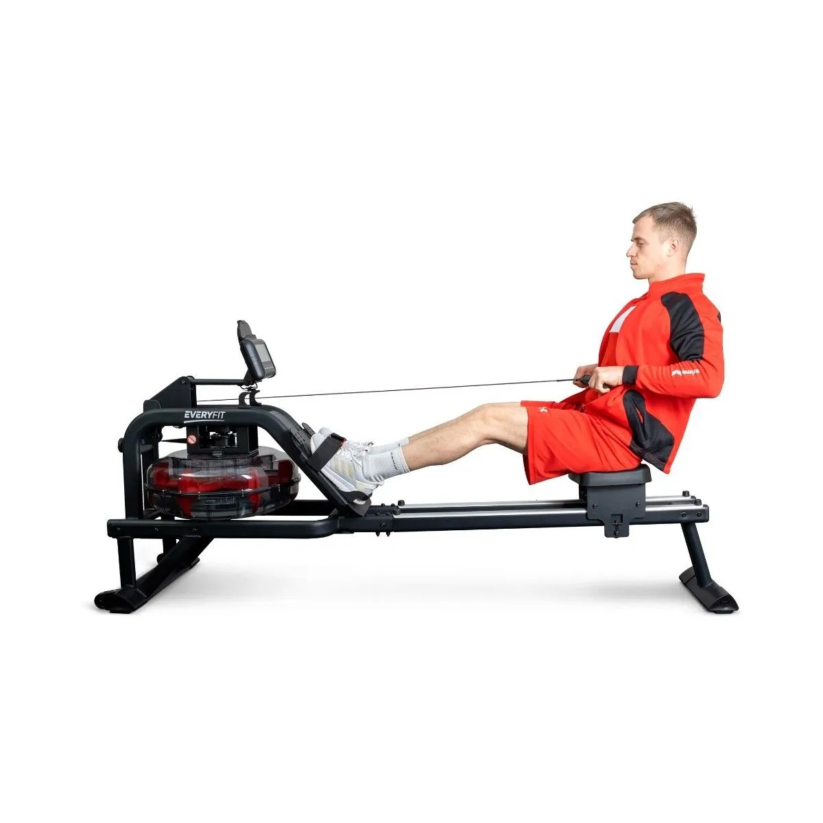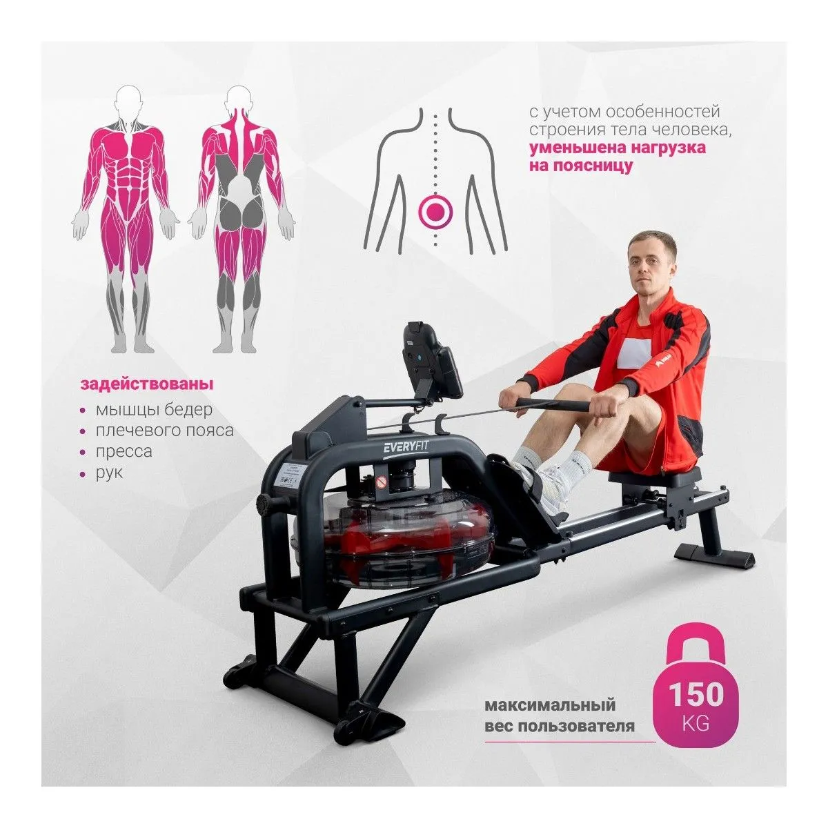 Everyfit ET-7446R — гребной тренажер для динамичных тренировок. На нем работают одновременно несколько групп мышц: бедер, плечевого пояса, пресса и рук. Тренажер подойдет для быстрого сброса веса и укрепления мышечного каркаса. Производители учли особенности строения тела человека, поэтому на гребном тренажере Everyfit уменьшена нагрузка на поясницу.