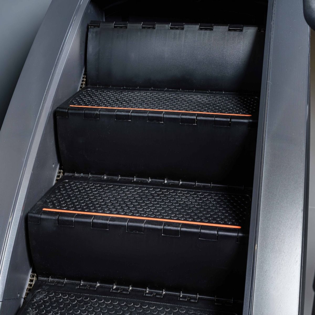 Две пары двухуровневый ступеней с рифленой поверхностью дают возможность сделать перерыв во время тренировки или выполнить подъём по ступеням одной ногой.
