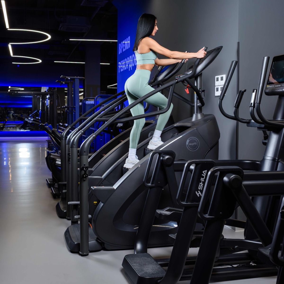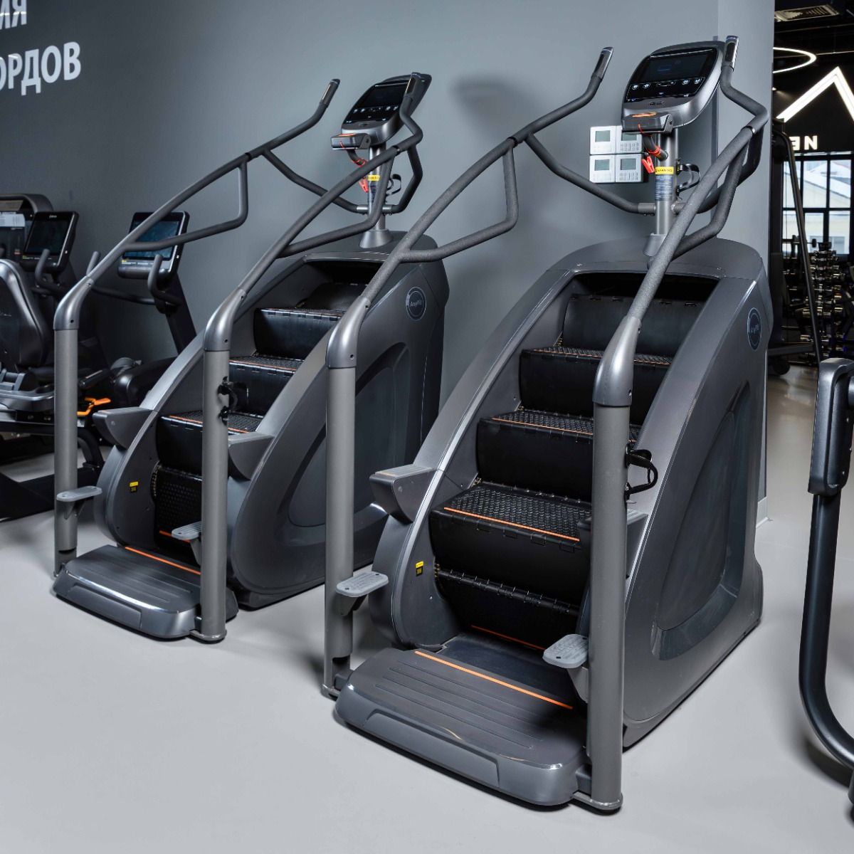 Две пары двухуровневый ступеней с рифленой поверхностью дают возможность сделать перерыв во время тренировки или выполнить подъём по ступеням одной ногой.