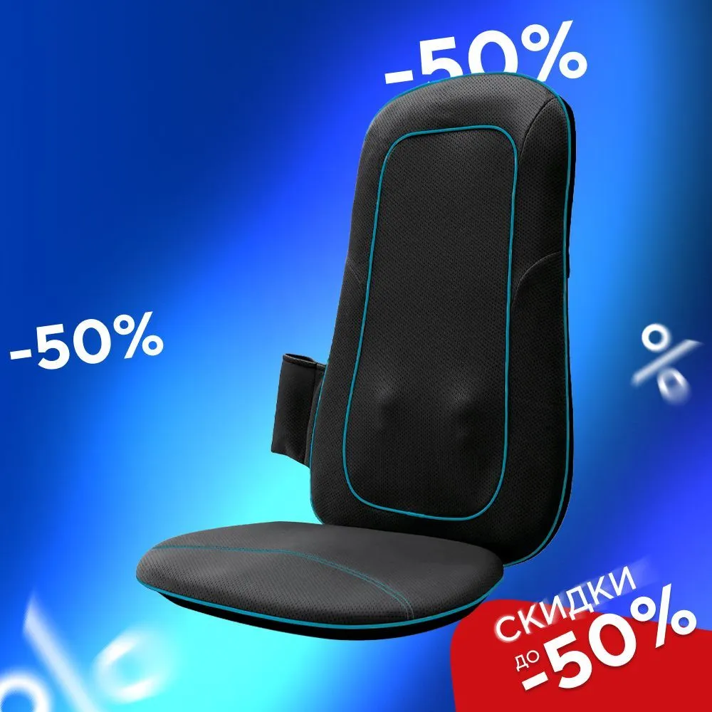 Зона массажа: Ягодицы, Спина, Поясница; Виды массажа: Вибромассаж, Роликовый; Функция подогрева; Пульт управления; Автоматическое отключение; Мощность: 24 Вт; Тип: Массажная накидка; Использование в автомобиле; Регулировка роликов по высоте; Материал накидки: Ткань