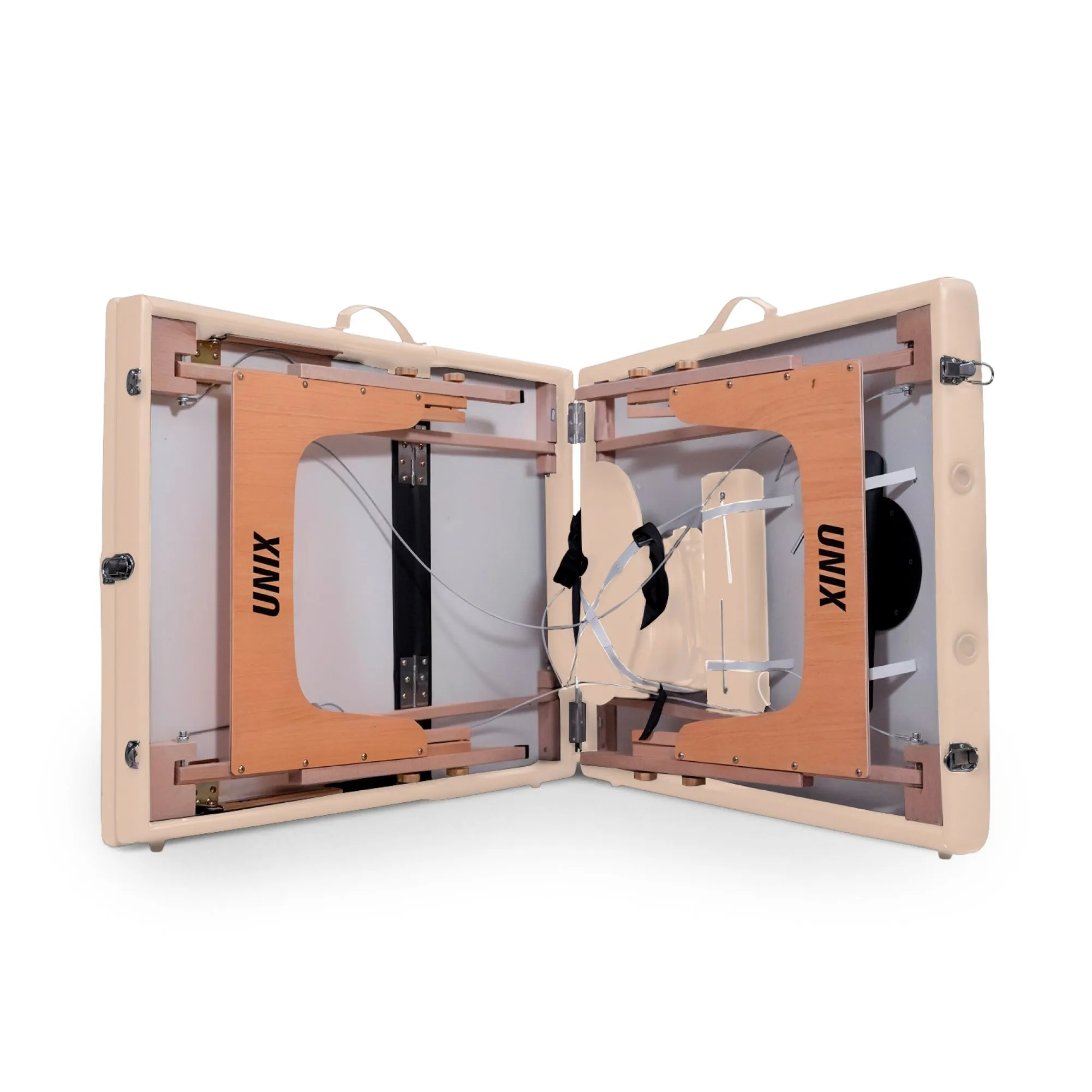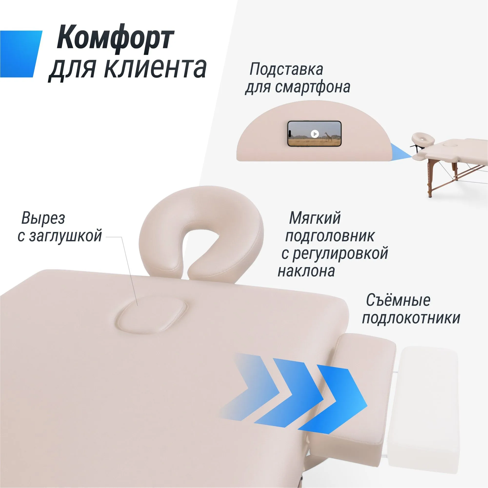 Подголовник обладает возможностью регулировки по высоте и наклону, обеспечивая идеальную поддержку головы и шеи. Ножная часть стола поднимается на 50 градусов (7 позиций), что позволяет клиентам занять самое удобное положение для проведения процедуры. Складной стол оборудован удобными подлокотниками 34х10 см, подвесной полкой для гаджетов 37,5х20 см и лямками с застежками-липучками.