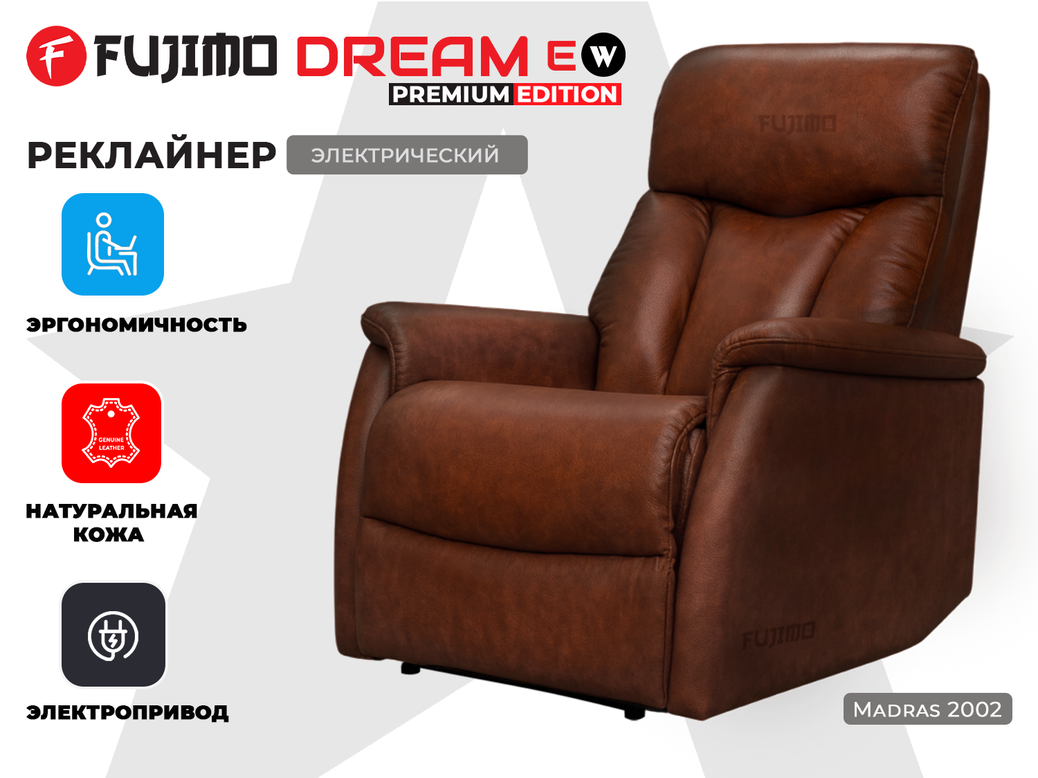 Электрическое кресло-реклайнер FUJIMO DREAM Premium выполнено из натуральной кожи MADRAS. Этот материал специально разработан для обивки мебели и отличается от других видов натуральной кожи высоким качеством выделки лицевой поверхности, повышенной прочностью и устойчивостью к истиранию. Благодаря таким качествам эта кожа обеспечит прекрасный внешний вид и отличные эксплуатационные характеристики на долгие годы.