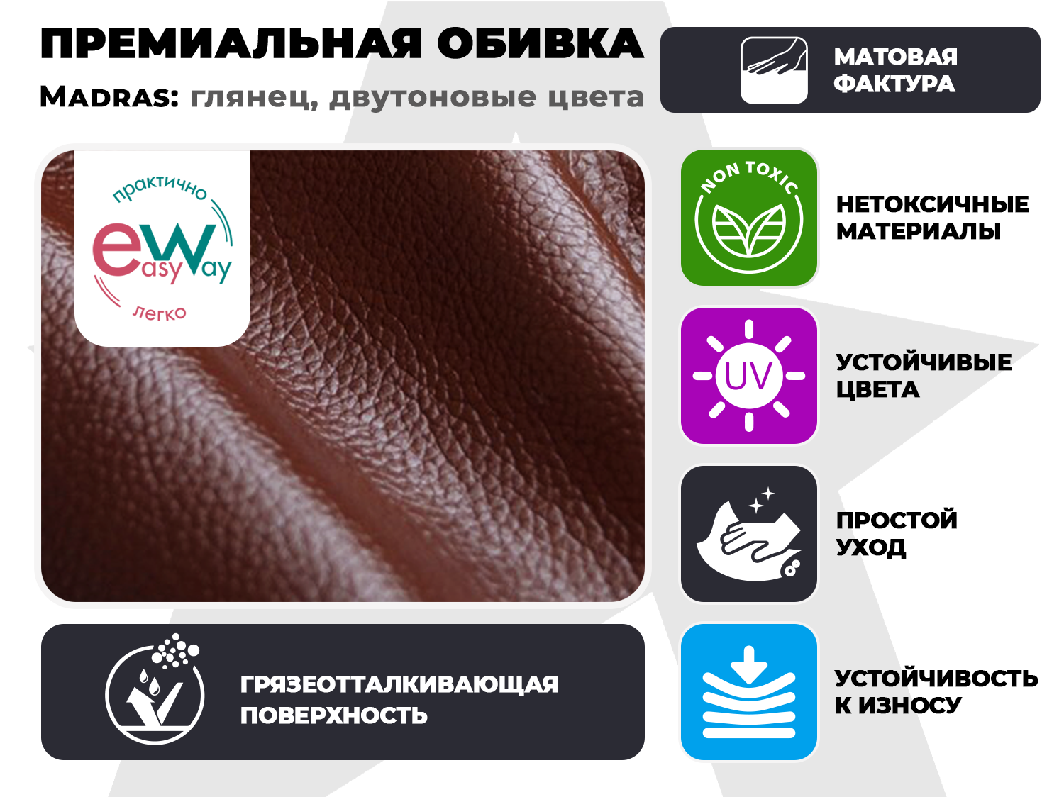 - Обивка из натуральной кожи MADRAS — качественное покрытие, разработанное специально для долгой службы и эстетики.