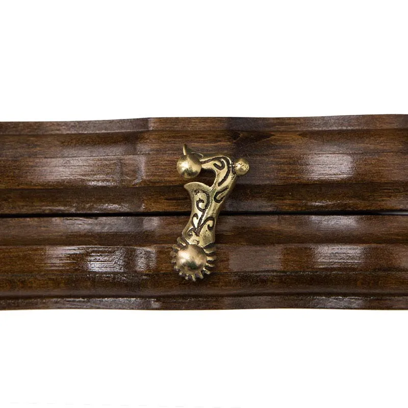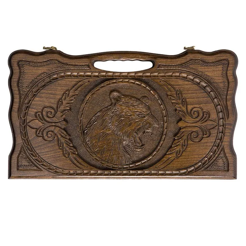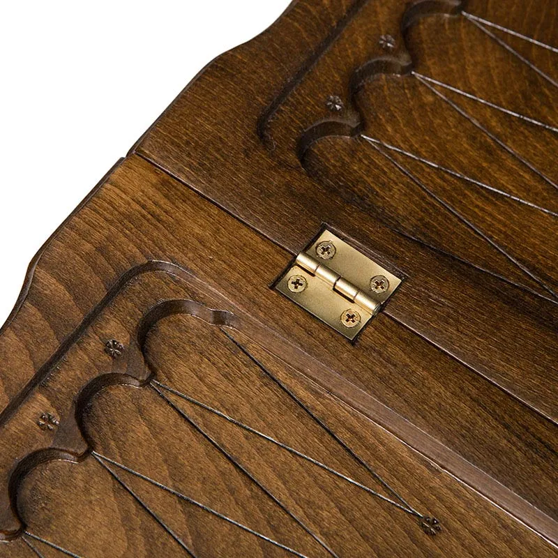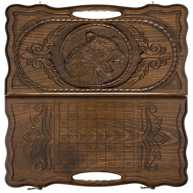 Две половинки доски соединены петлями из бронзы, на которых нанесена эмблема в форме буквы H. Для того чтобы они не раскрывались, предусмотрены два специальных крючка, также бронзовые. Внутри имеются 32 фишки, по 16 каждого цвета и пара костей. Кстати к фишкам снизу приклеена ткань, т.к. во время партии участники нередко с силой бьют ими по доске, что может привести к трещинам или вовсе к поломке, а теперь такого не произойдет.